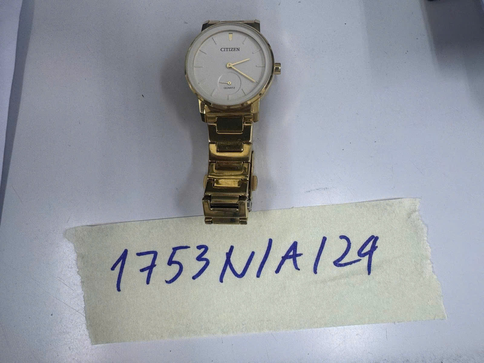 Ngày tiếp nhận: 13/10/2024 Mã hồ sơ: 1753N2024A Mô tả: 01 Đồng hồ kim loại có chữ "CITIZEN" mặt màu trắng, dây kim loại màu vàng. |