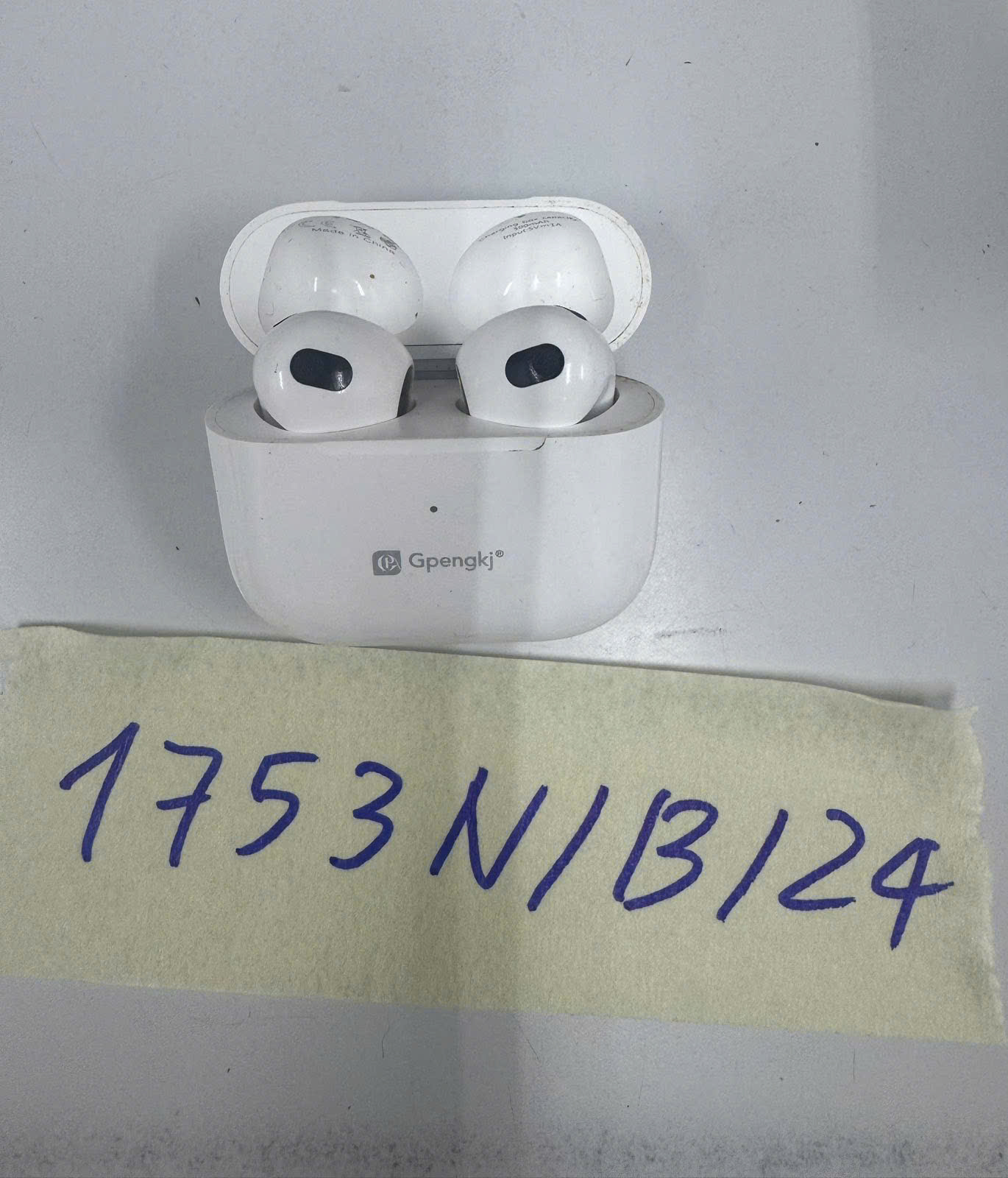Ngày tiếp nhận: 13/10/2024 Mã hồ sơ: 1753N2024B Mô tả: 01 Tai nghe màu trắng có chữ Gpengkj. |