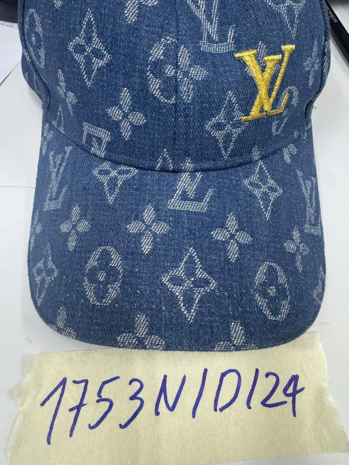 Ngày tiếp nhận: 13/10/2024 Mã hồ sơ: 1753N2024D Mô tả: 01 Nón vải màu xanh họa tiết màu trắng, vàng bên trong mũ có ghi chữ "LOUIS VUITTON". |
