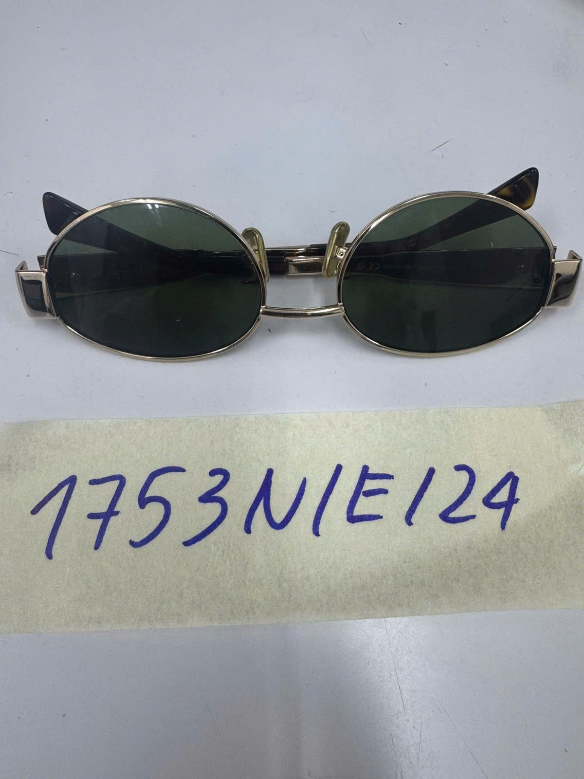 Ngày tiếp nhận: 13/10/2024 Mã hồ sơ: 1753N2024E Mô tả: 01 Mắt kính gọng kim loại màu vàng có chữ "CELINE". |
