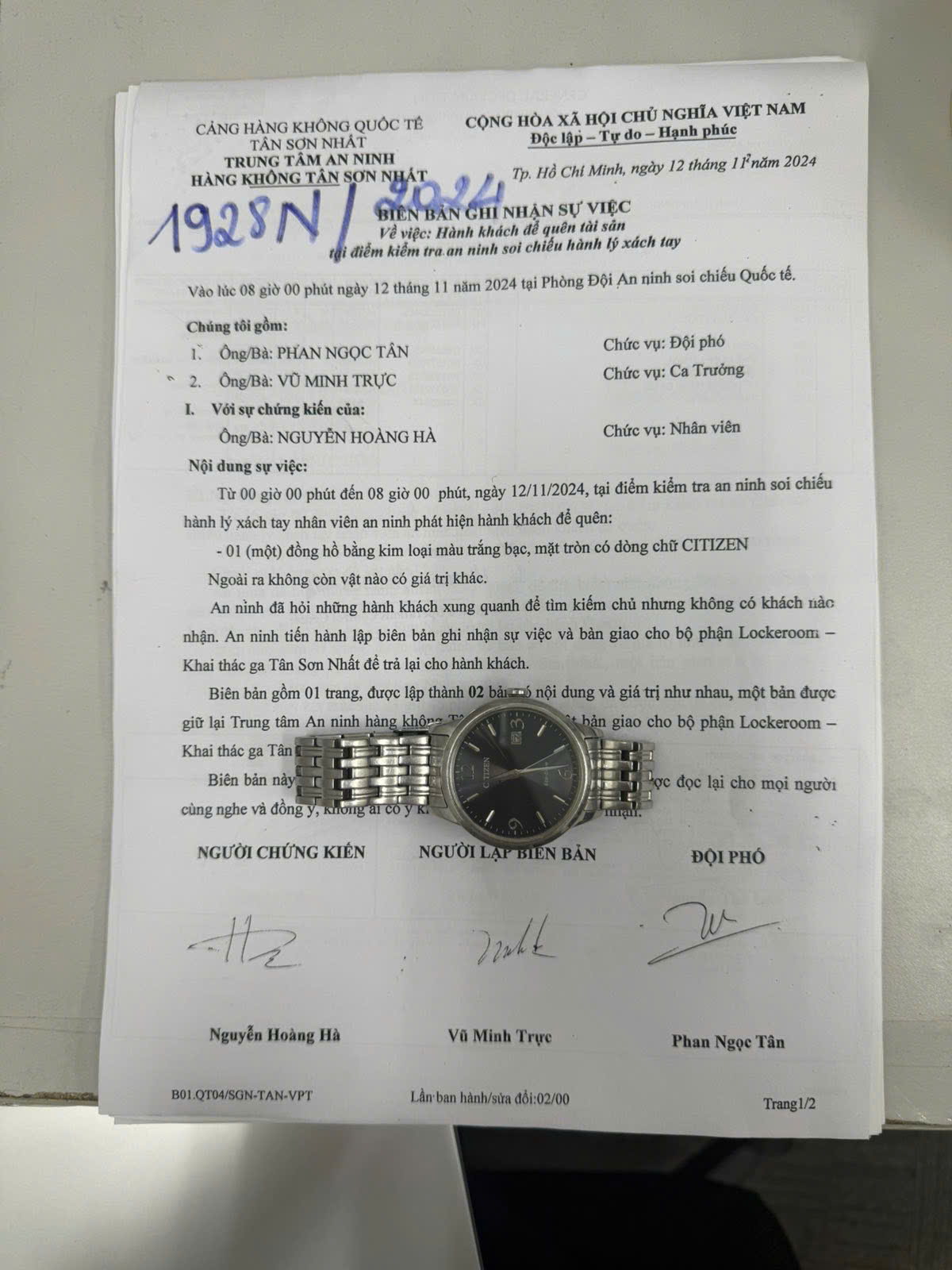 Ngày tiếp nhận: 12/11/2024 Mã hồ sơ: 1928N2024 Mô tả: 01 đồng hồ kim loại màu trắng bạc, mặt tròn có dòng chữ CITIZEN. |