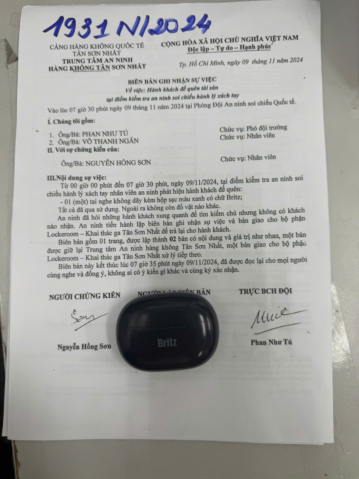 Ngày tiếp nhận: 12/11/2024 Mã hồ sơ: 1931N2024 Mô tả: 01 tai nghe không dây kèm hộp sạc màu xanh chữ BRITZ đã qua sử dụng. |