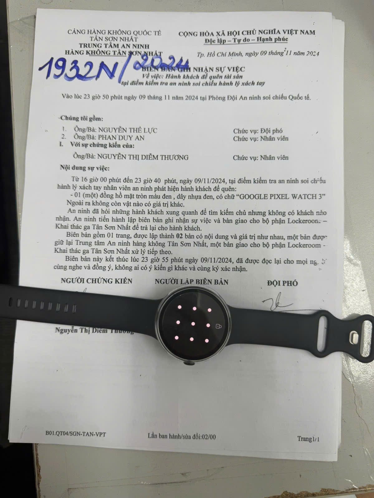 Ngày tiếp nhận: 12/11/2024 Mã hồ sơ: 1932N2024 Mô tả: 01 đồng hồ mặt tròn màu đen, dây nhựa đen, có chữ GOOGLE PIXEL WATCH 3. |