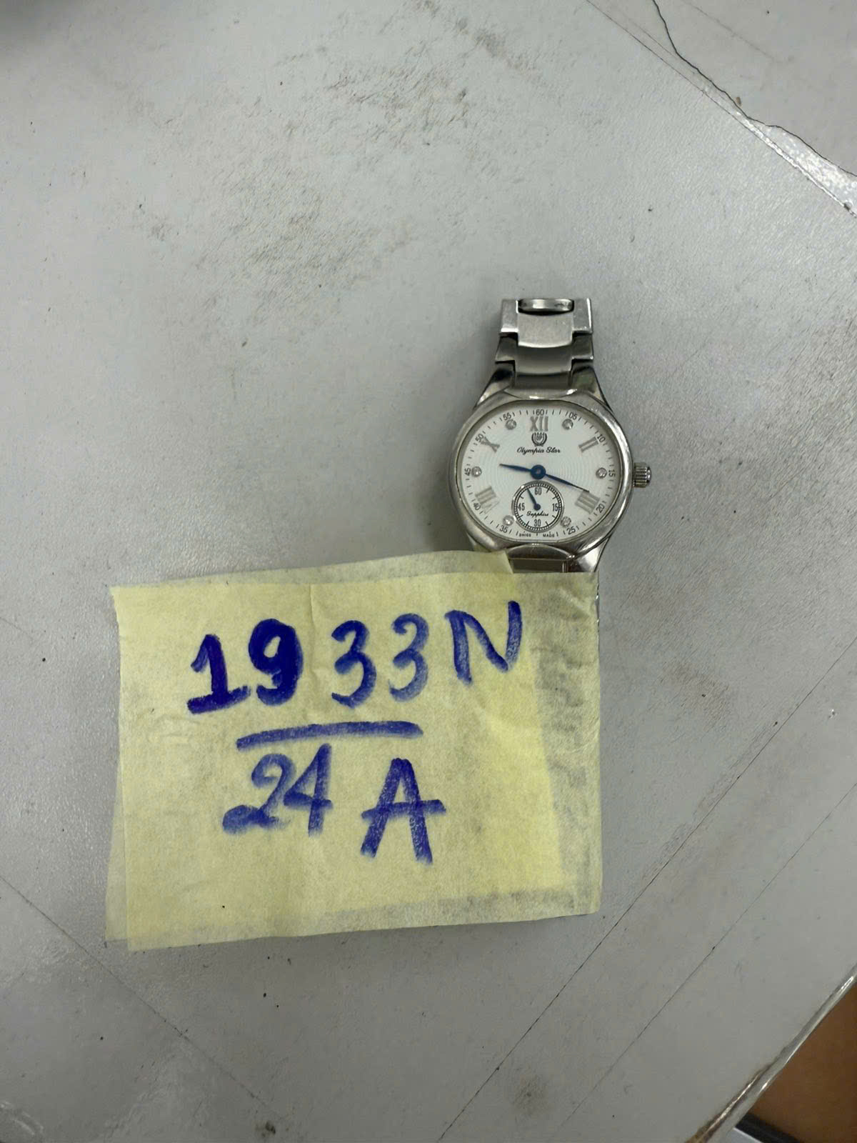 Ngày tiếp nhận: 12/11/2024 Mã hồ sơ: 1933N2024A Mô tả: 01 đồng hồ kim loại màu trắng mặt có chữ OLYMPIA STAR, mặt sau có dãy số 58028L-210, dây đeo bằng kim loại màu trắng. |