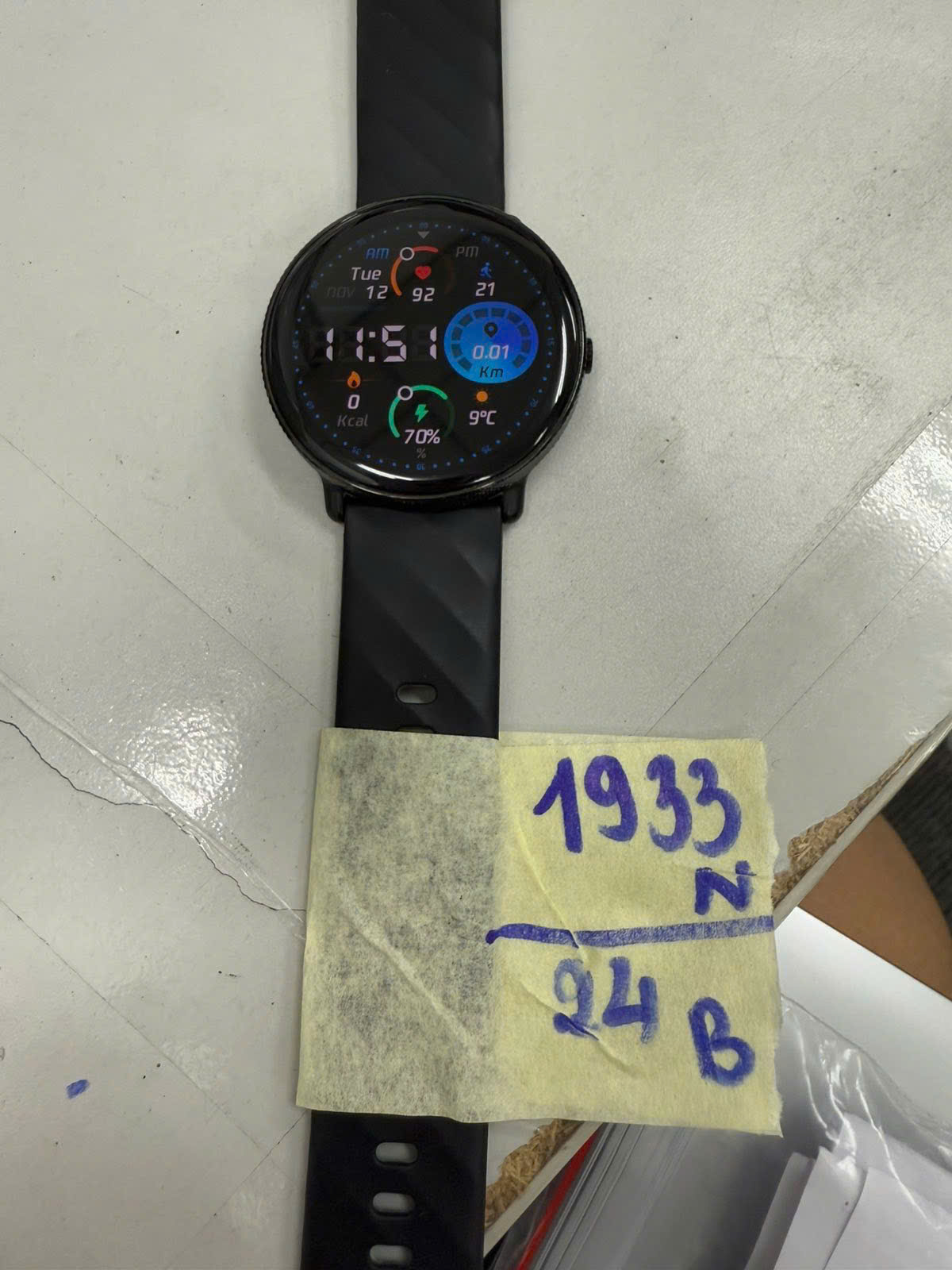 Ngày tiếp nhận: 12/11/2024 Mã hồ sơ: 1933N2024B Mô tả: 01 đồng hồ điện tử mặt tròn màu đen, mặt sau có chữ SMART WATCH -ROHS, dây đeo băng silicon màu đen. |