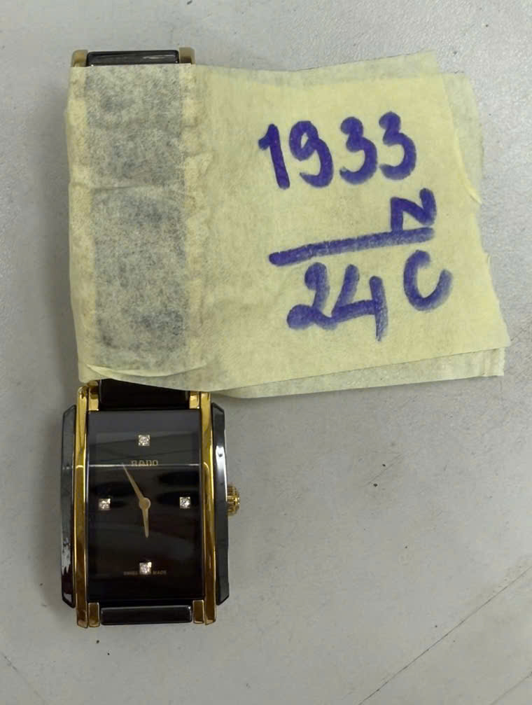 Ngày tiếp nhận: 12/11/2024 Mã hồ sơ: 1933N2024C Mô tả: 01 đồng hồ bằng kim loại chữ nhật màu đen, mặt đồng hồ có chữ RADO, mặt sau có dãy số 15666224, dây đeo bằng kim loại màu vàng đen có chữ RADO. |