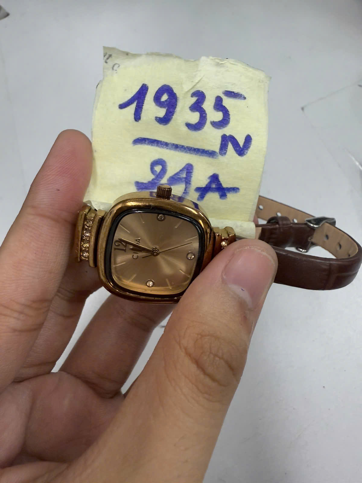 Ngày tiếp nhận: 12/11/2024 Mã hồ sơ: 1935N2024A Mô tả: 01 Đồng hồ màu vàng, dây đeo màu nâu, trên đồng hồ có chữ CILOA. |