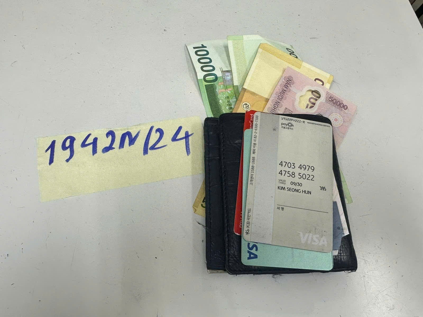 Ngày tiếp nhận: 13/11/2024 Mã hồ sơ: 1942N2024 Mô tả: 01 ví da màu xanh sẫm bên trong có: 01(một) tờ tiền mệnh giá 50.000VND, 01 tờ tiền mệnh giá 50.000won, 02 tờ 10.000 won, một vài thẻ nhựa các loại. |
