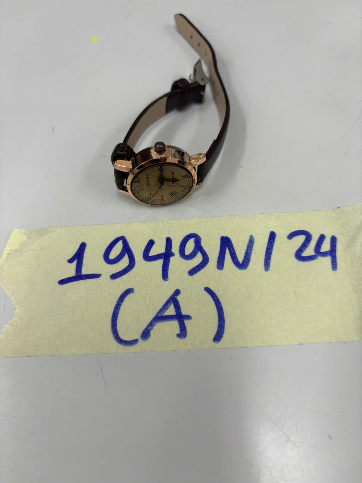Ngày tiếp nhận: 14/11/2024 Mã hồ sơ: 1949N2024A Mô tả: 01 đồng hồ mặt tròn dây da màu nâu có chữ BAILEY. |