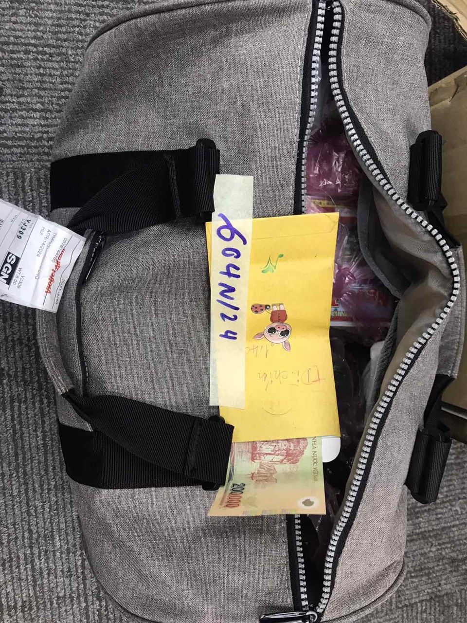 Ngày tiếp nhận: 14/4/2024 Mô tả: 01 túi xách bằng vải màu xám có chữ LANGHUTOU bên trong có một số bộ quần áo cũ. |