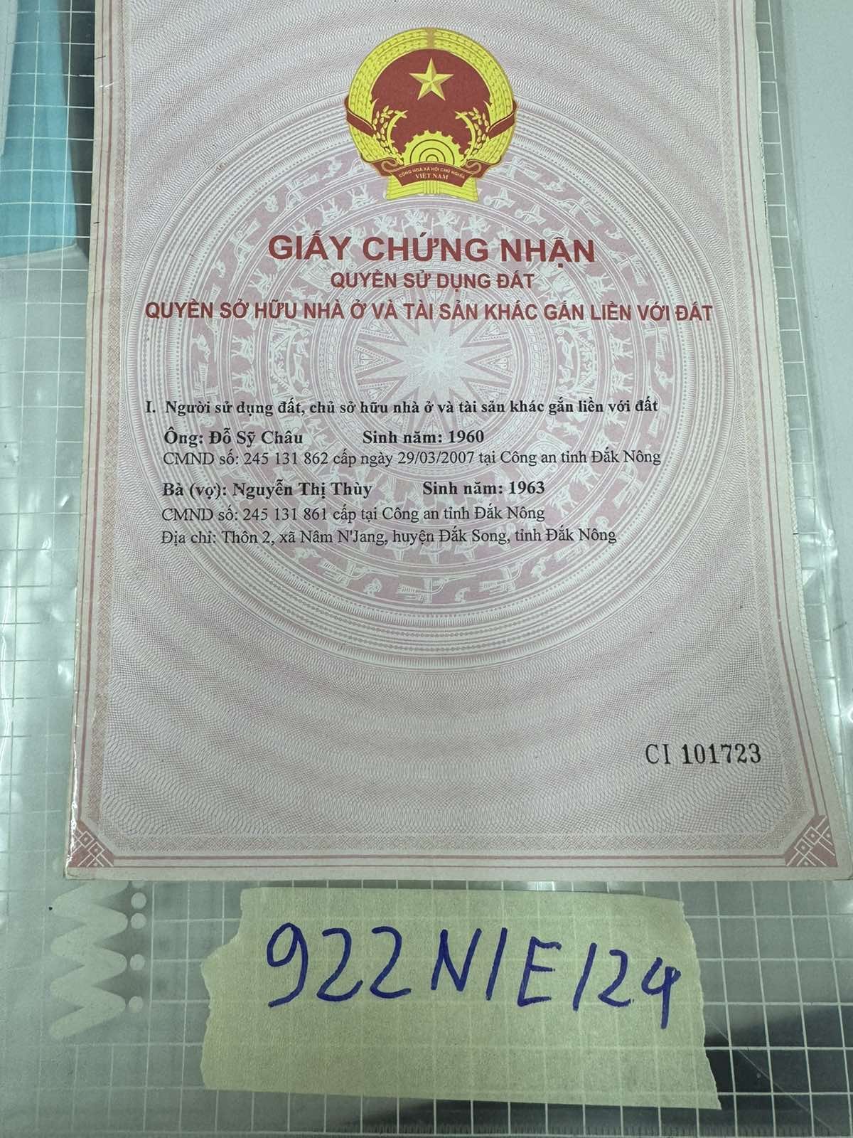 Ngày tiếp nhận: 13/6/2024 Mã hồ sơ: 922N2024E Mô tả: 01 bìa sơ-mi có dán chữ Đak-Nông chứa 01 giấy chứng nhận quyền sử dụng đất tên Đỗ Sỹ Châu - 1960 CI101723 và 01 trang bổ sung giấy chứng nhận sổ phát hành GCN: CI101723. |