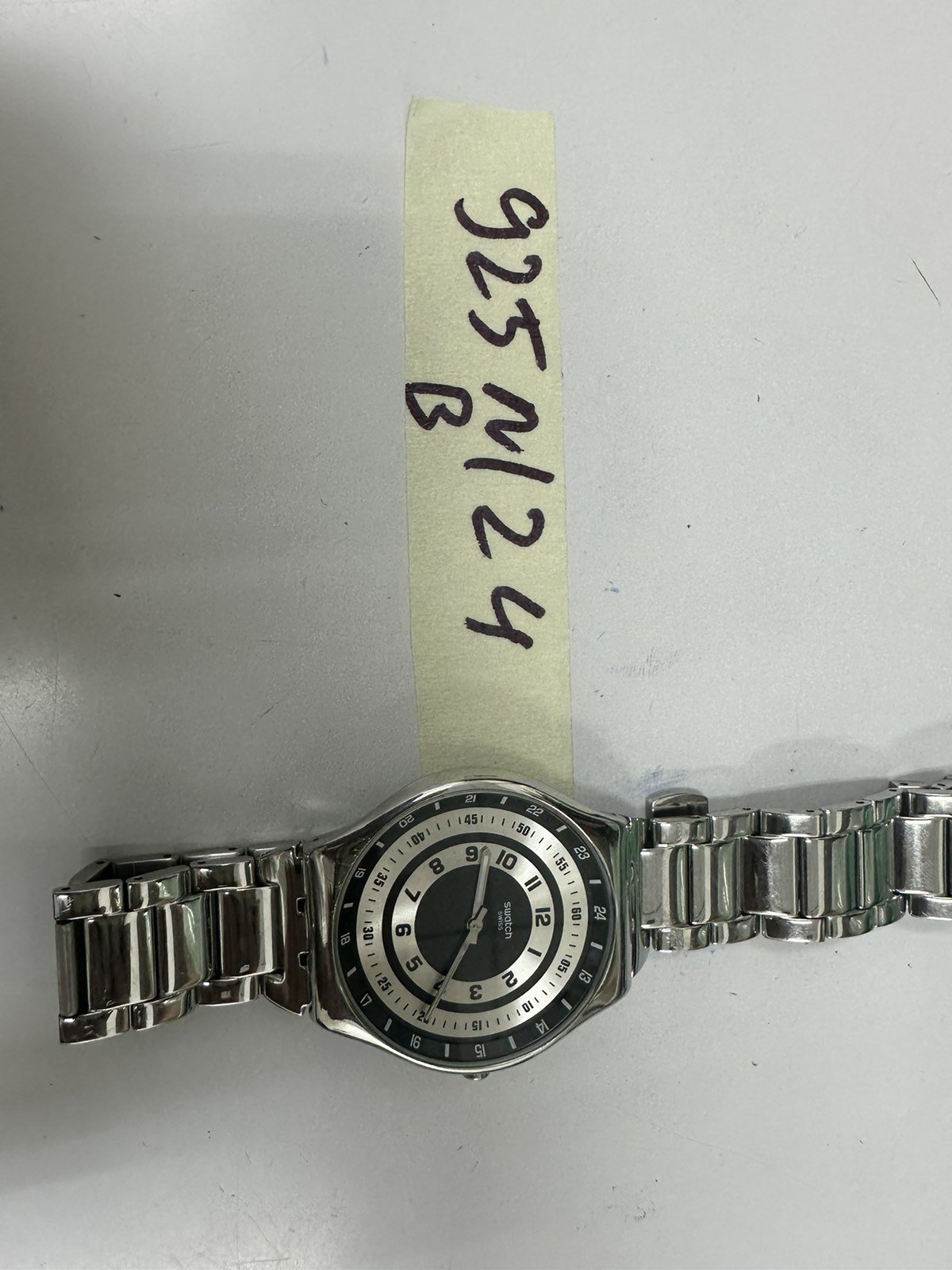 Ngày tiếp nhận: 14/6/2024 Mã hồ sơ: 925N2024B Mô tả: 01 đồng hồ kim loại màu trắng, mặt đồng hồ tròn có chữ SWATCH, mặt sau đồng hồ có chữ 315/SR716SW. |