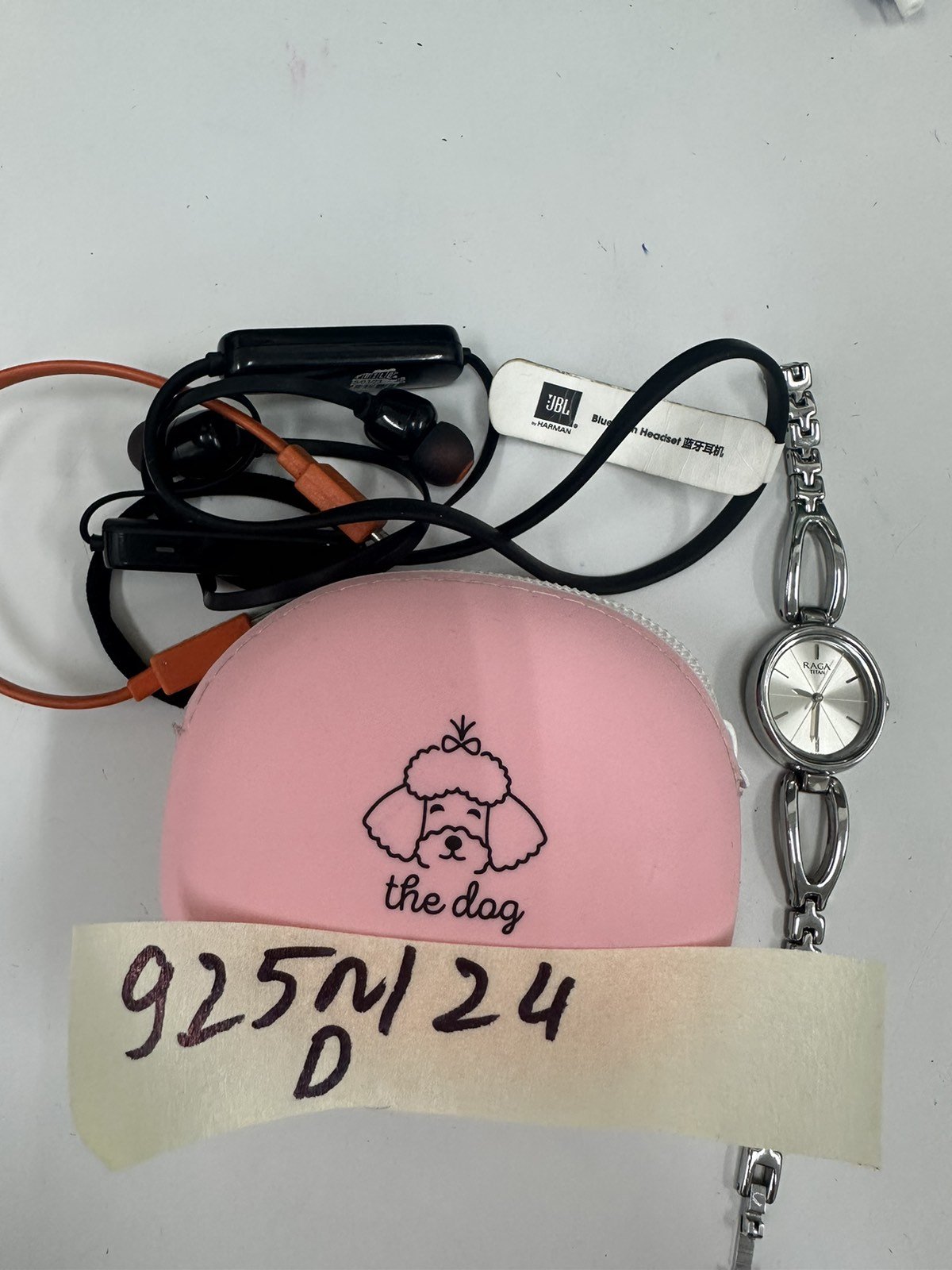 Ngày tiếp nhận: 14/6/2024 Mã hồ sơ: 925N2024D Mô tả: 01 đồng hồ bằng kim loại màu trắng, mặt đồng hồ hình bầu dục có chữ RAGA Titan mặt sau có dãy số 2579SAC; đồng hồ để bên trong túi khóa zip nhỏ màu hồng cùng với một tai nghe bluetooth JBL Model TUNE115BTK. |