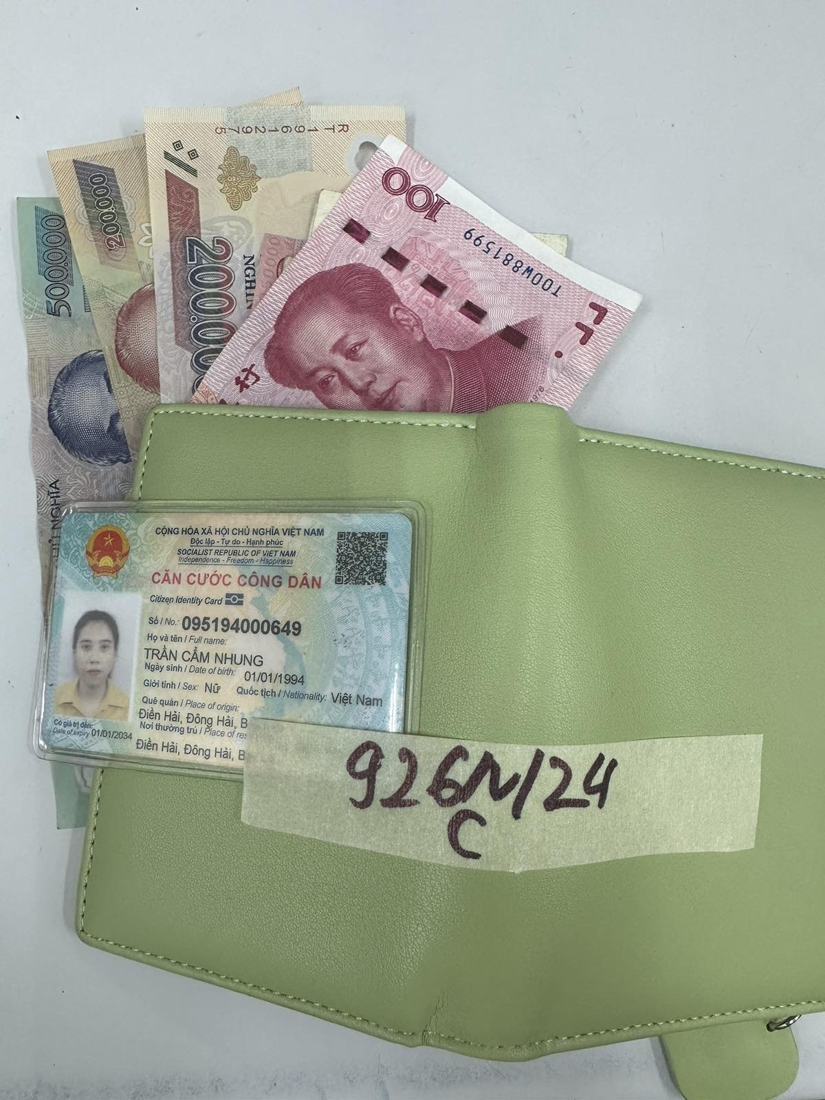 Ngày tiếp nhận: 14/6/2024 Mã hồ sơ: 926N2024C Mô tả: 01 bóp da màu xanh nõn chuối có chữ MINISO bên trong có 01 thẻ CCCD và 02 thẻ ngân hàng mang tên TRẦN CẨM NHUNG có tiền mặt bao gồm 100 NDT, 959.000 VNĐ. |