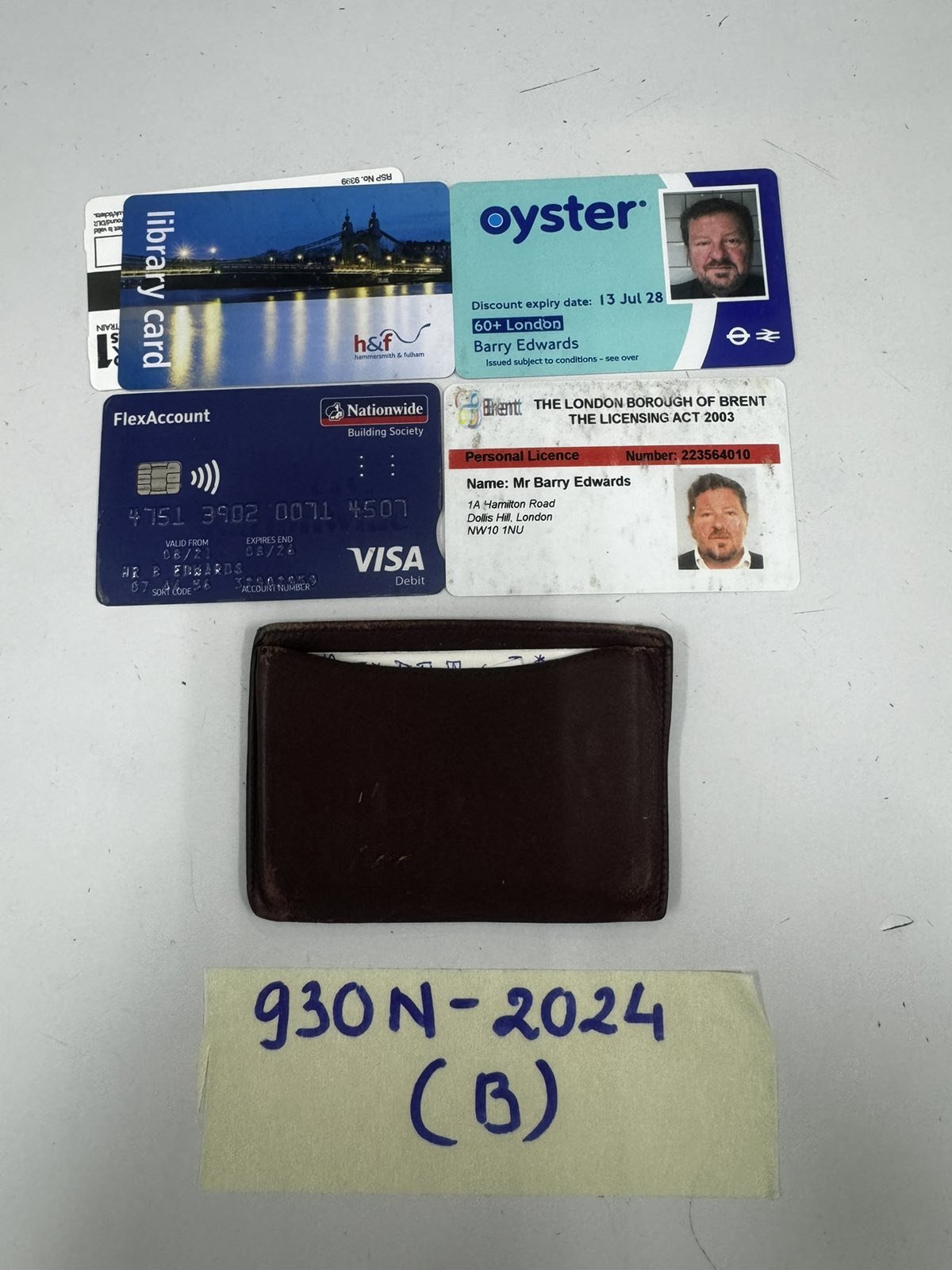 Ngày tiếp nhận: 15/6/2024 Mã hồ sơ: 930N2024B Mô tả: 01 ví đựng thẻ màu nâu đỏ bên trong gồm thẻ cá nhân và 01 thẻ ngân hàng đều mang tên BARRY EDWARDS. |
