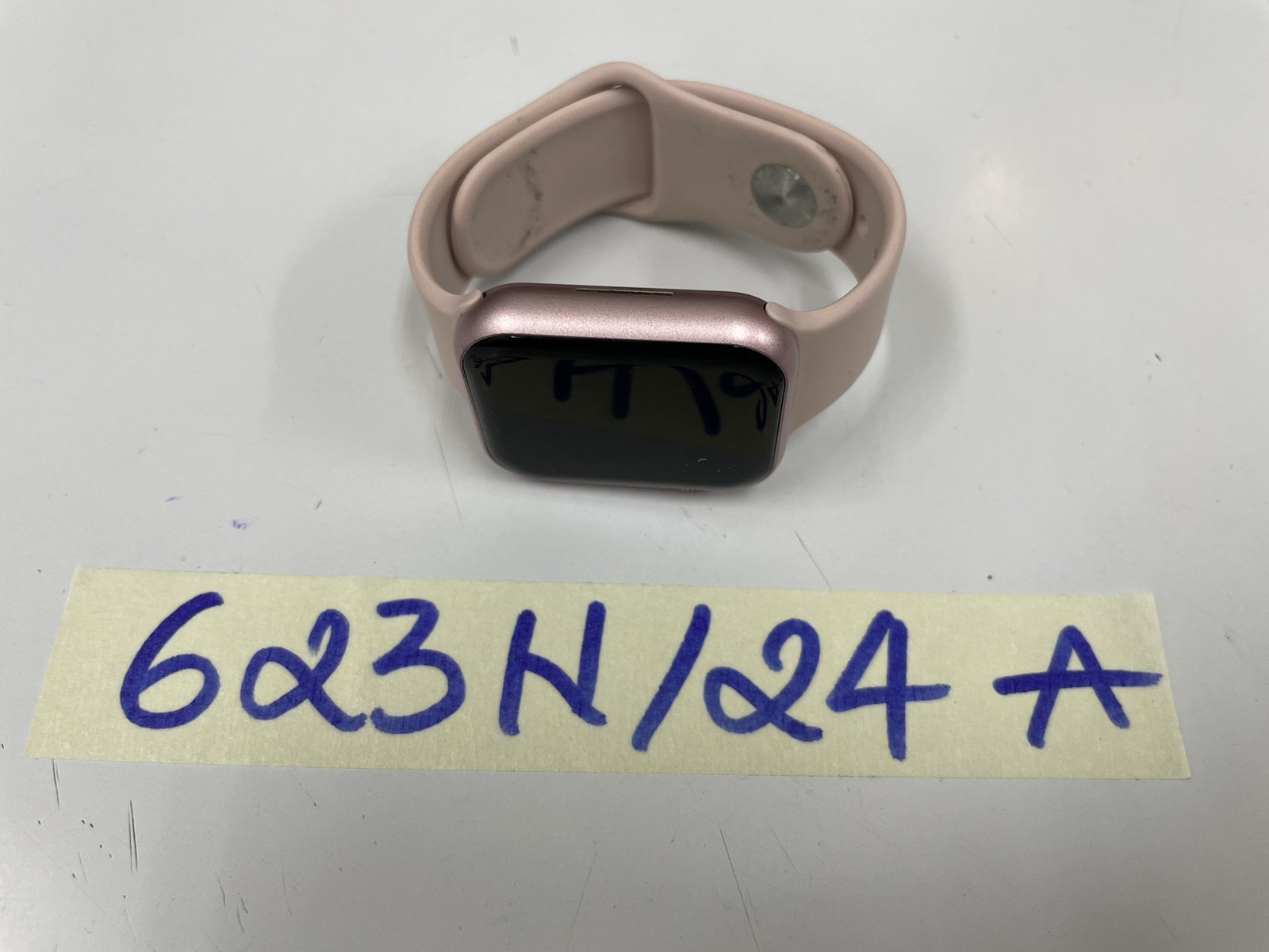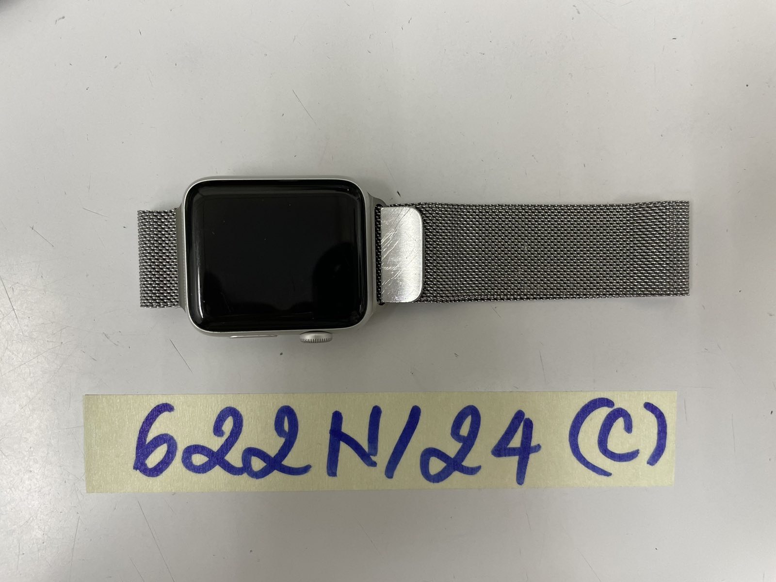 Ngày tiếp nhận: 19/4/2024 có logo APPLE (SERIES 2), mặt hình chữ nhật, dây được làm bằng kim loại màu trắng. |