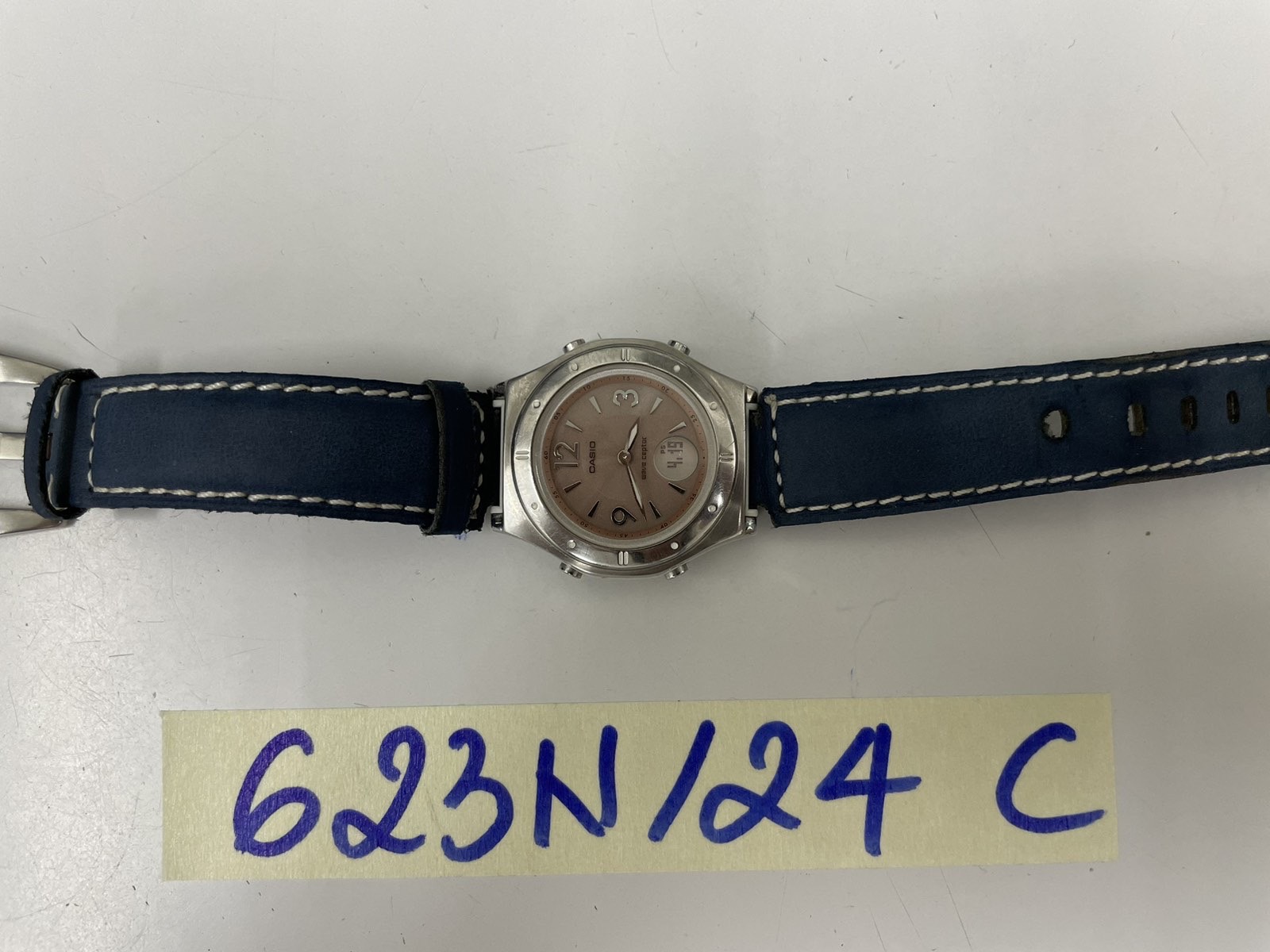 Ngày tiếp nhận: 19/4/2024 có logo CASIO mặt tròn, dây da màu xanh dương. |