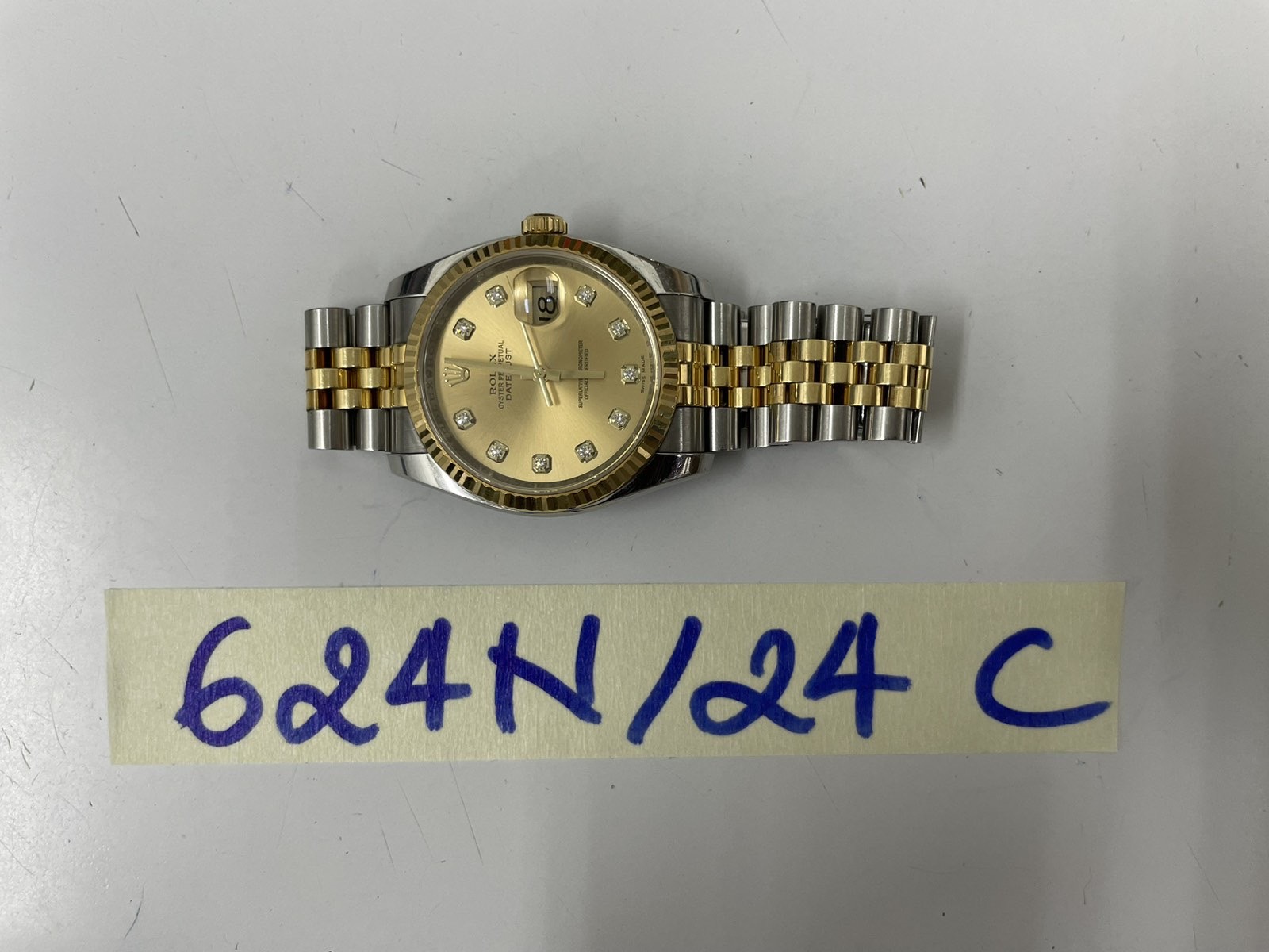 Ngày tiếp nhận: 19/4/2024 logo ROLEX OYSTER PERPETUAL DATEJUST mặt tròn màu vàng dây bằng kim loại màu trắng vàng có mã số M524D585. |