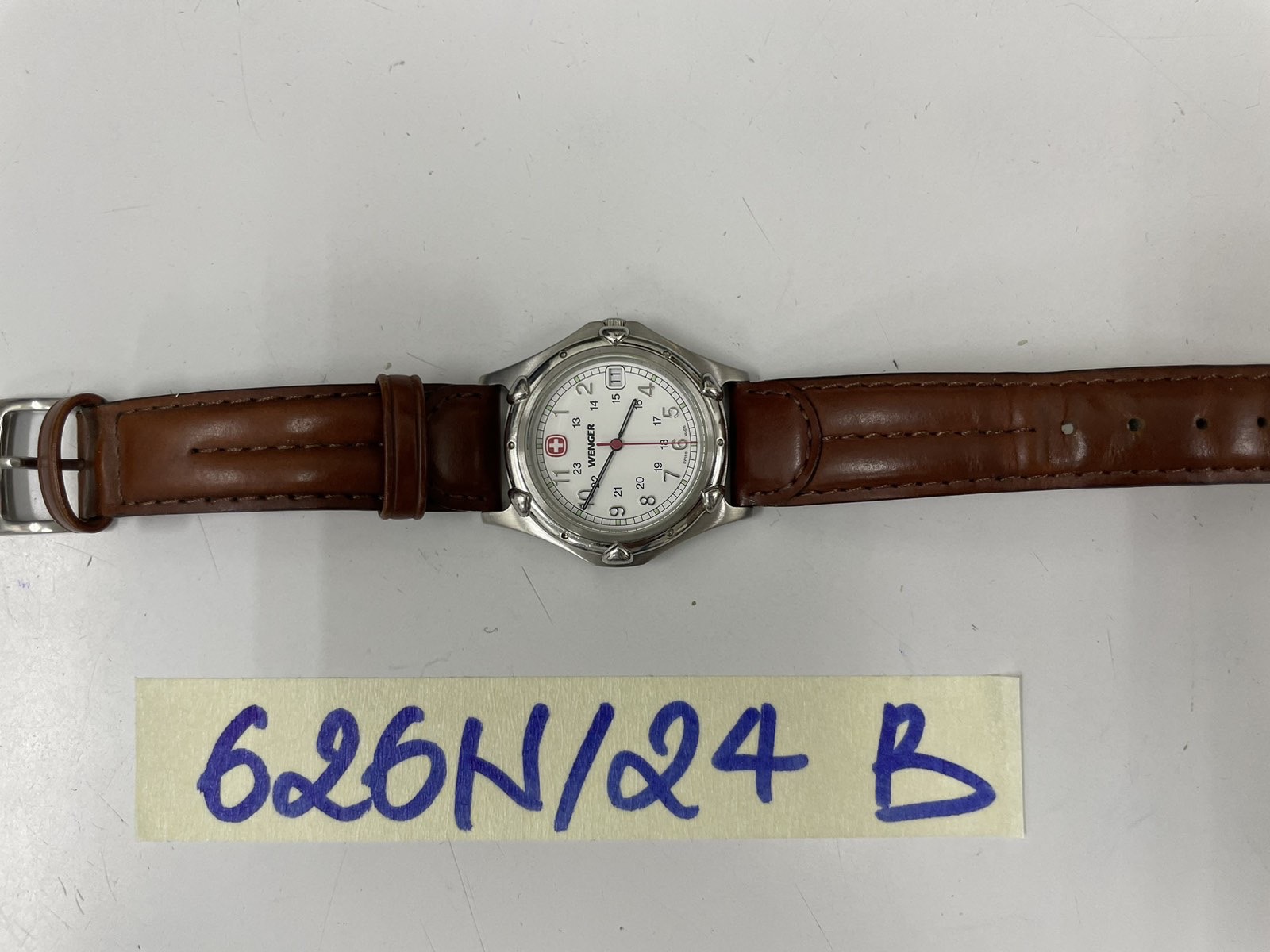Ngày tiếp nhận: 19/4/2024 logo WENGER mặt màu trắng, dây da màu nâu. Vị trí: An ninh soi chiếu quốc tế |