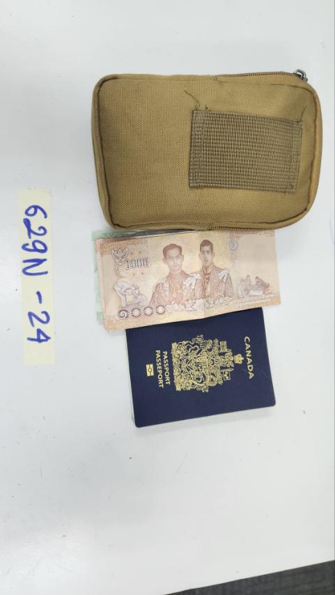 Ngày tiếp nhận: 19/4/2024 BAR ZALMAN số hộ chiếu AD831377 quốc tịch CANADA và 01 túi vải bên trong có 02 thẻ và tiền mặt tổng 9020 bạc Thái. |