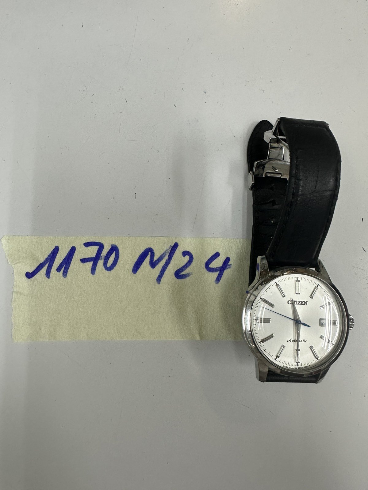 Ngày tiếp nhận: 20/7/2024 Mã hồ sơ: 1170N2024 Mô tả: 01 đồng hồ đeo tay mặt bằng kim loại màu trắng dây bằng da màu đen, Mặt đồng hồ có dòng chữ Citizen. |
