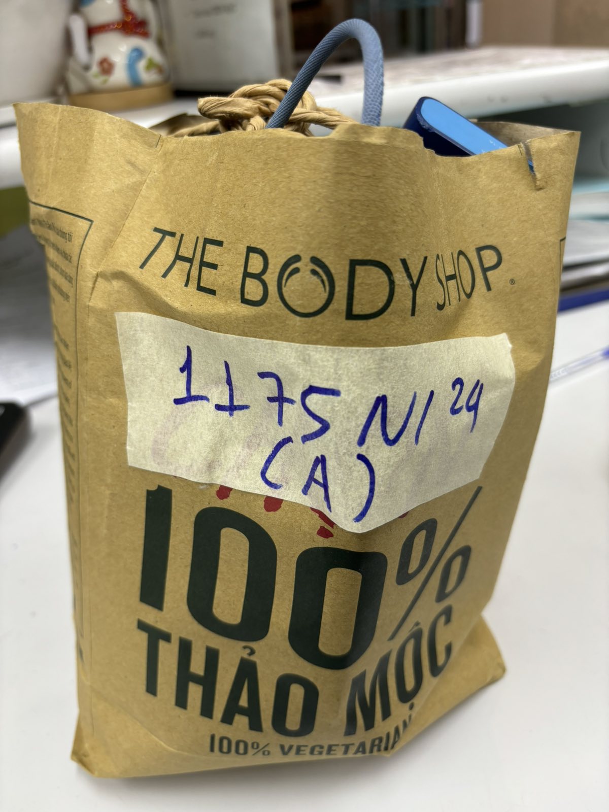 Ngày tiếp nhận: 21/7/2024 Mã hồ sơ: 1175N2024B Mô tả: 01 túi bóng (quầy vé VNA) có 01 áo khoác, 01 đôi giày màu nâu, 04 túi hạt điều, 03 túi café có chữ Trung Nguyên, 01 chai nước hoa màu nâu có chữ DIESEL chưa qua sử dụng, 06 chai dầu gió, 02 quạt đeo cổm ngoài ra không còn gì khác. |