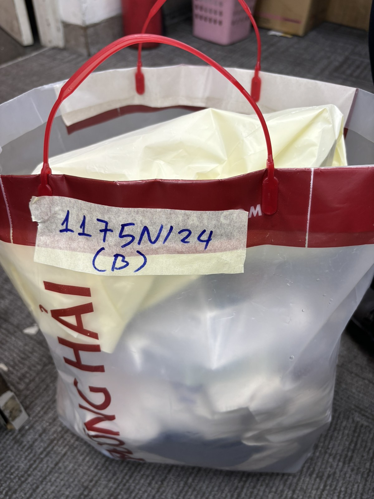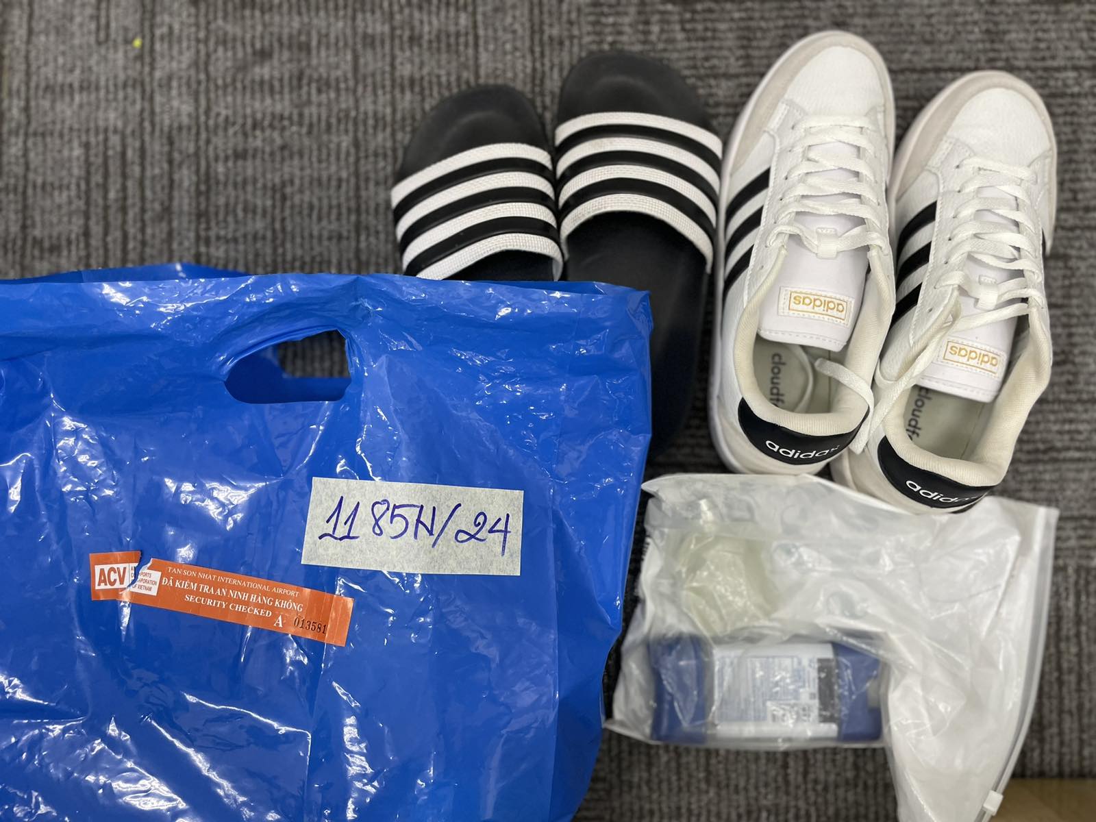 Ngày tiếp nhận: 22/7/2024 Mã hồ sơ: 1185N2024 Mô tả: 01 túi nilon màu xanh bên trong có 01 đôi giày hiệu Adidas màu trắng, 01 đôi dép hiệu Adidas màu đen, 01 chai nước hoa hiệu Dolce&Gabbana và một số vật cá nhân. |
