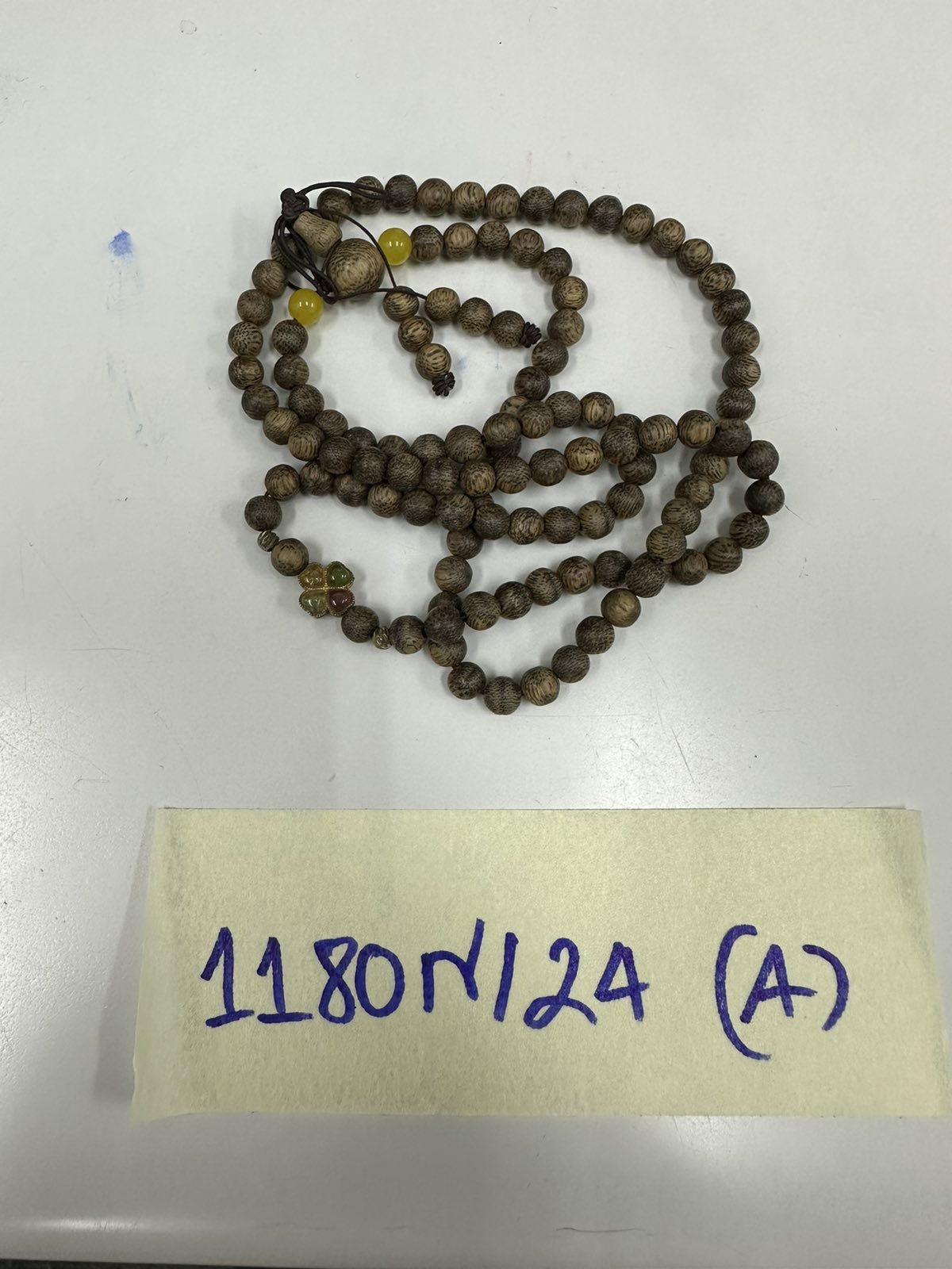 Ngày tiếp nhận: 21/7/2024 Mã hồ sơ: 1180N2024A Mô tả: 01 chuỗi vòng hạt bằng gỗ, có 2 hạt màu vàng và 01 biểu tượng có 4 lá trong chuỗi hạt. |