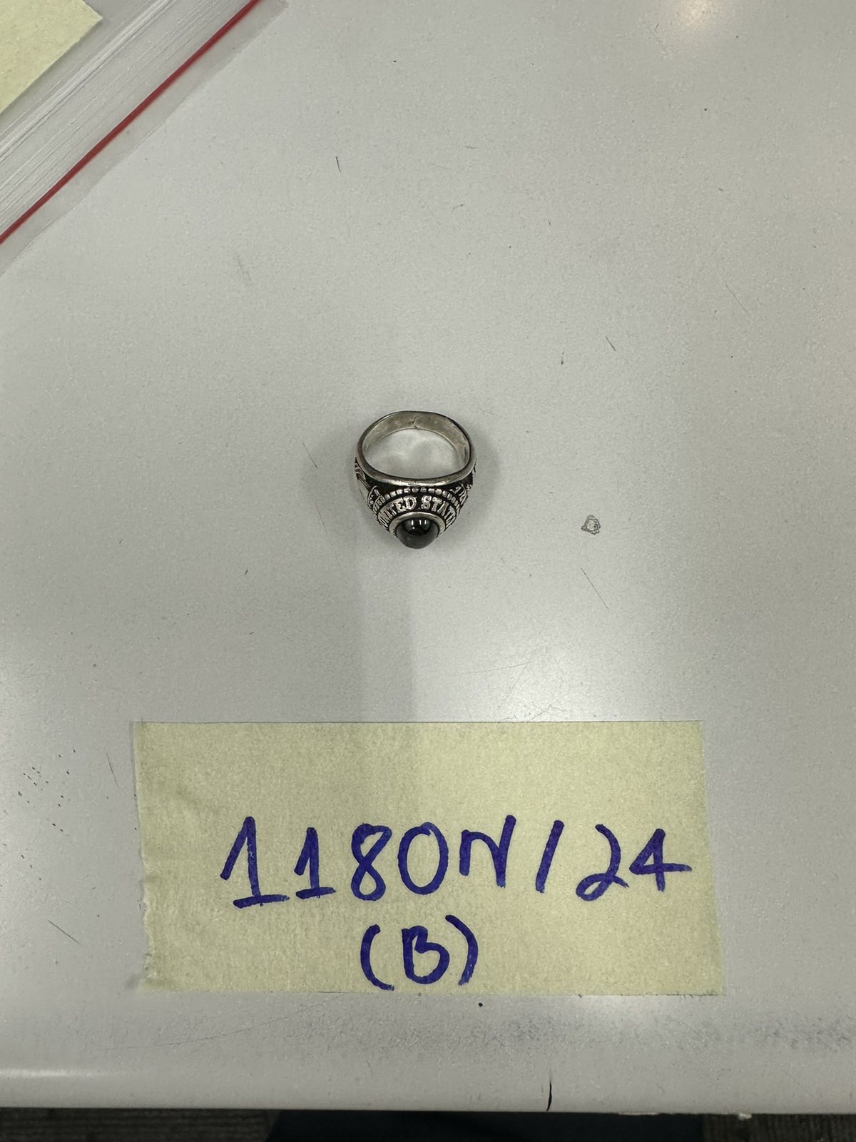 Ngày tiếp nhận: 21/7/2024 Mã hồ sơ: 1180N2024B Mô tả: 01 nhẫn màu bạc, có chữ United States Air Force ở trên mặt, giữa mặt nhẫn có đính 1 viên đá màu đen. |