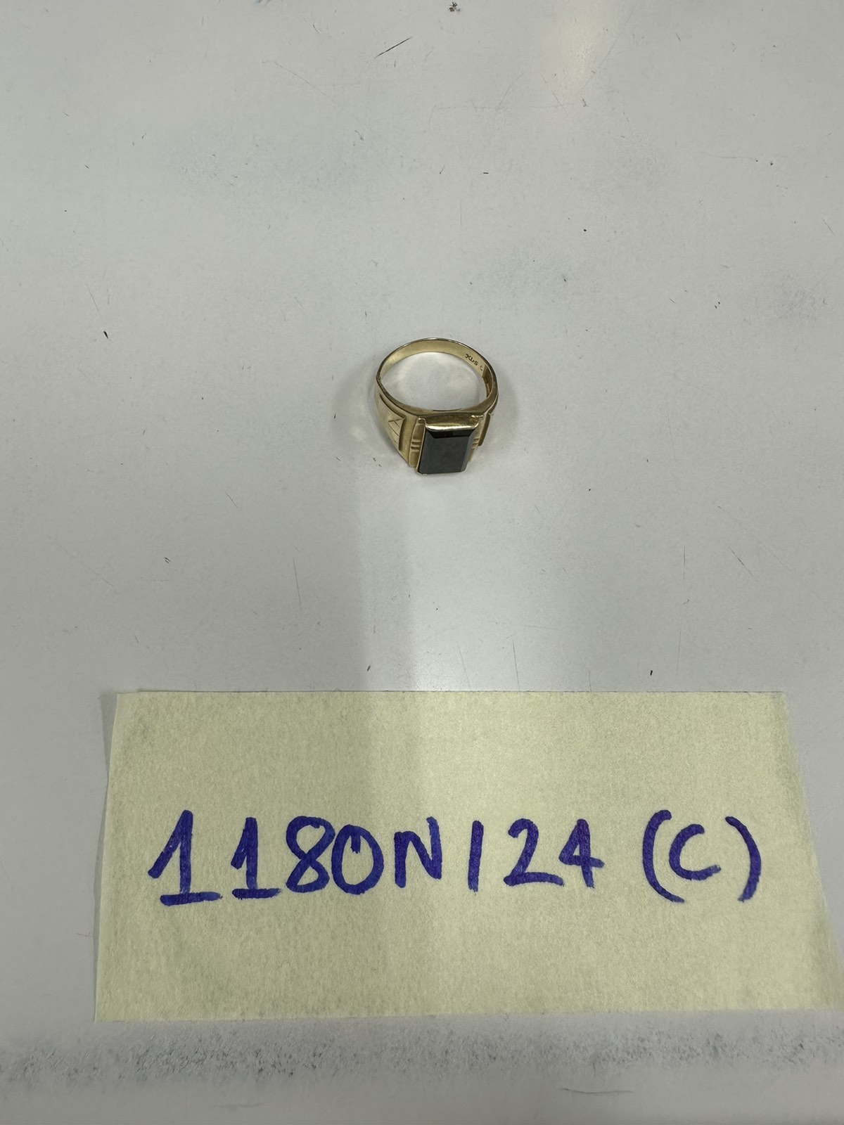 Ngày tiếp nhận: 21/7/2024 Mã hồ sơ: 1180N2024C Mô tả: 01 nhẫn màu vàng, có số 63 sau nhẫn, mặt nhẫn có đính đá màu đen hình chữ nhật. |