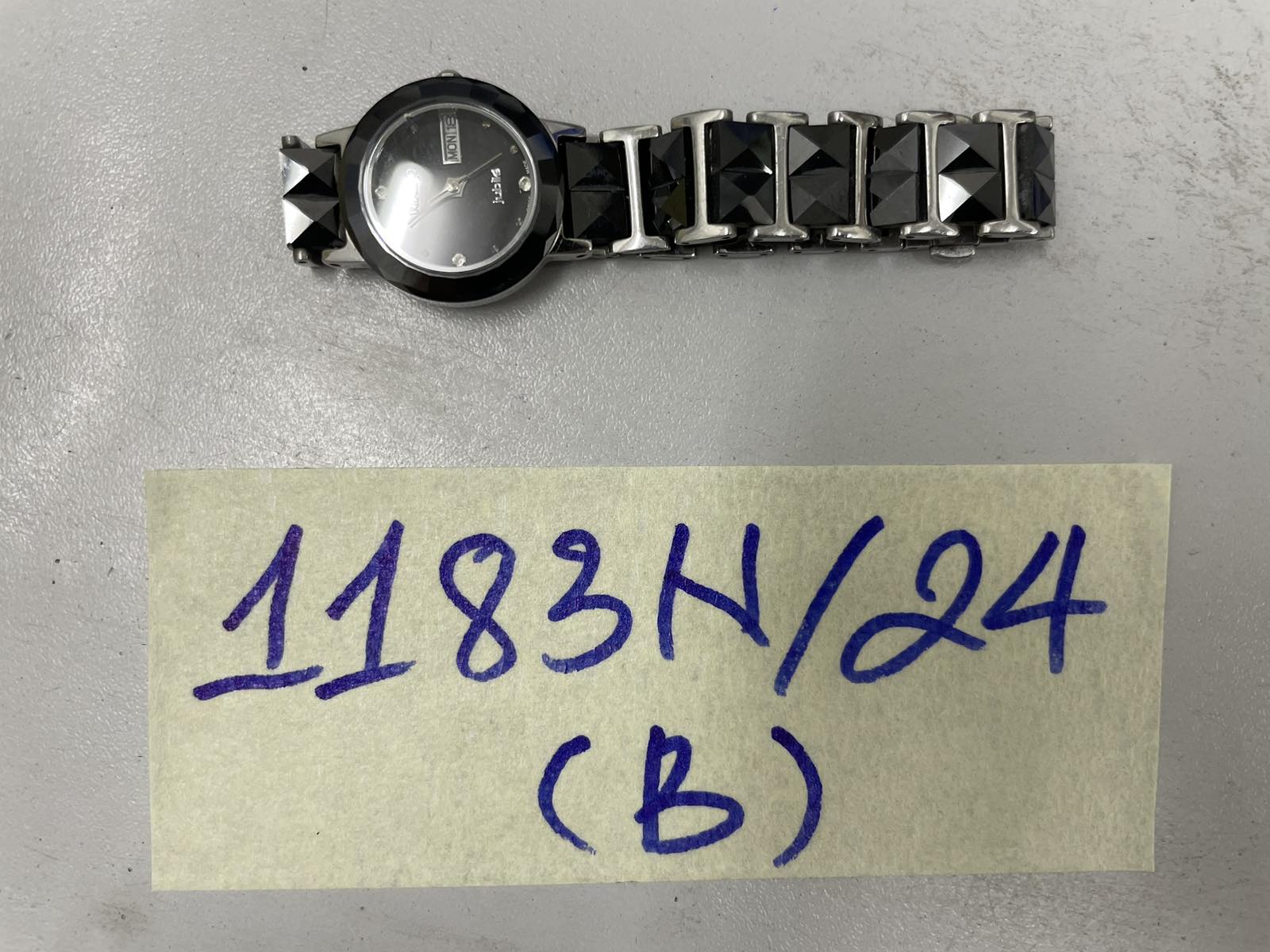 Ngày tiếp nhận: 22/7/2024 Mã hồ sơ: 1183N2024B Mô tả: 01 đồng hồ màu bạc, dây kim loại màu đen bạc hiệu RADO |