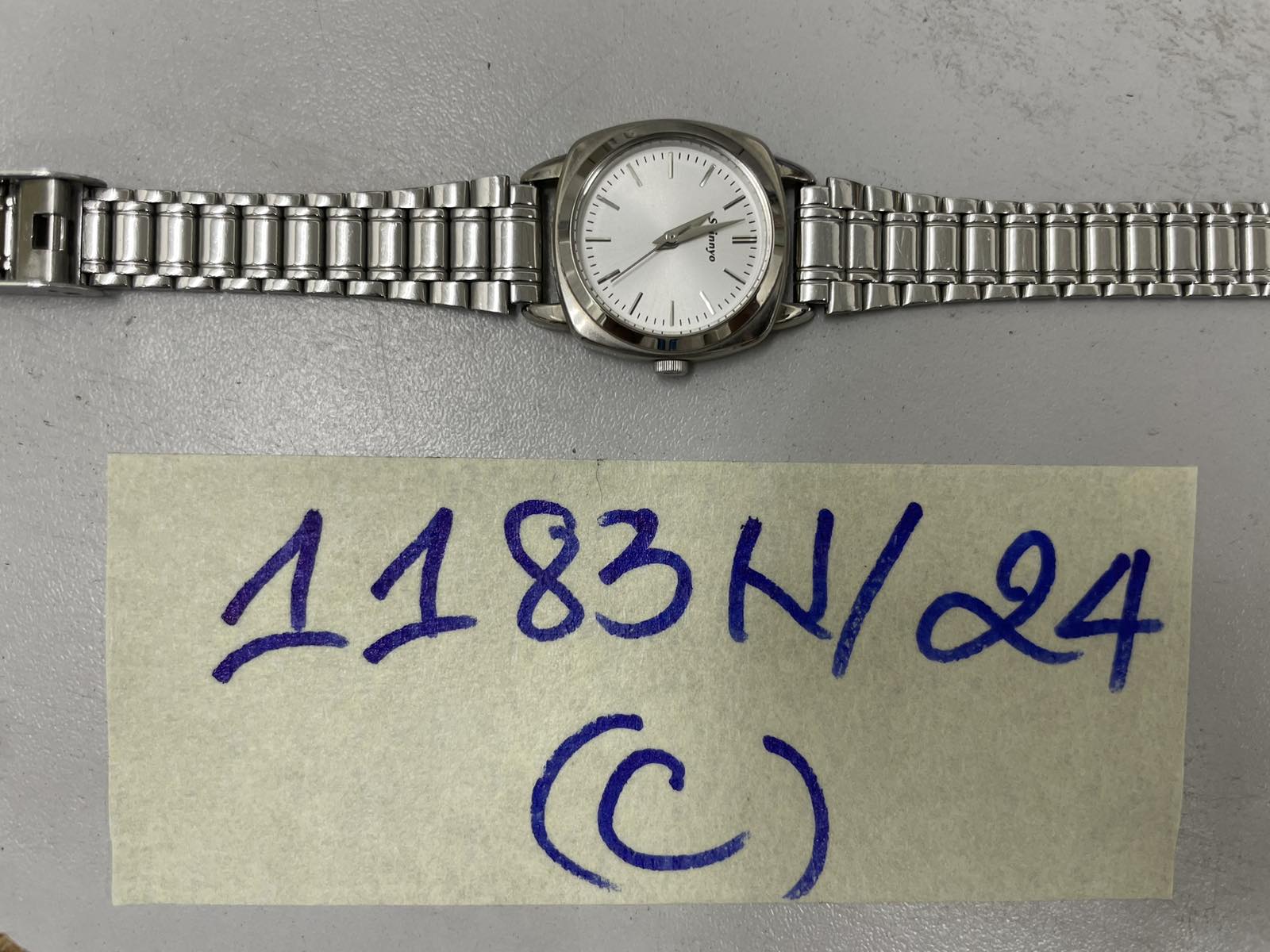 Ngày tiếp nhận: 22/7/2024 Mã hồ sơ: 1183N2024C Mô tả: 01 đồng hồ màu bạc, dây kim loại màu bạc, hiệu Shinnyo |