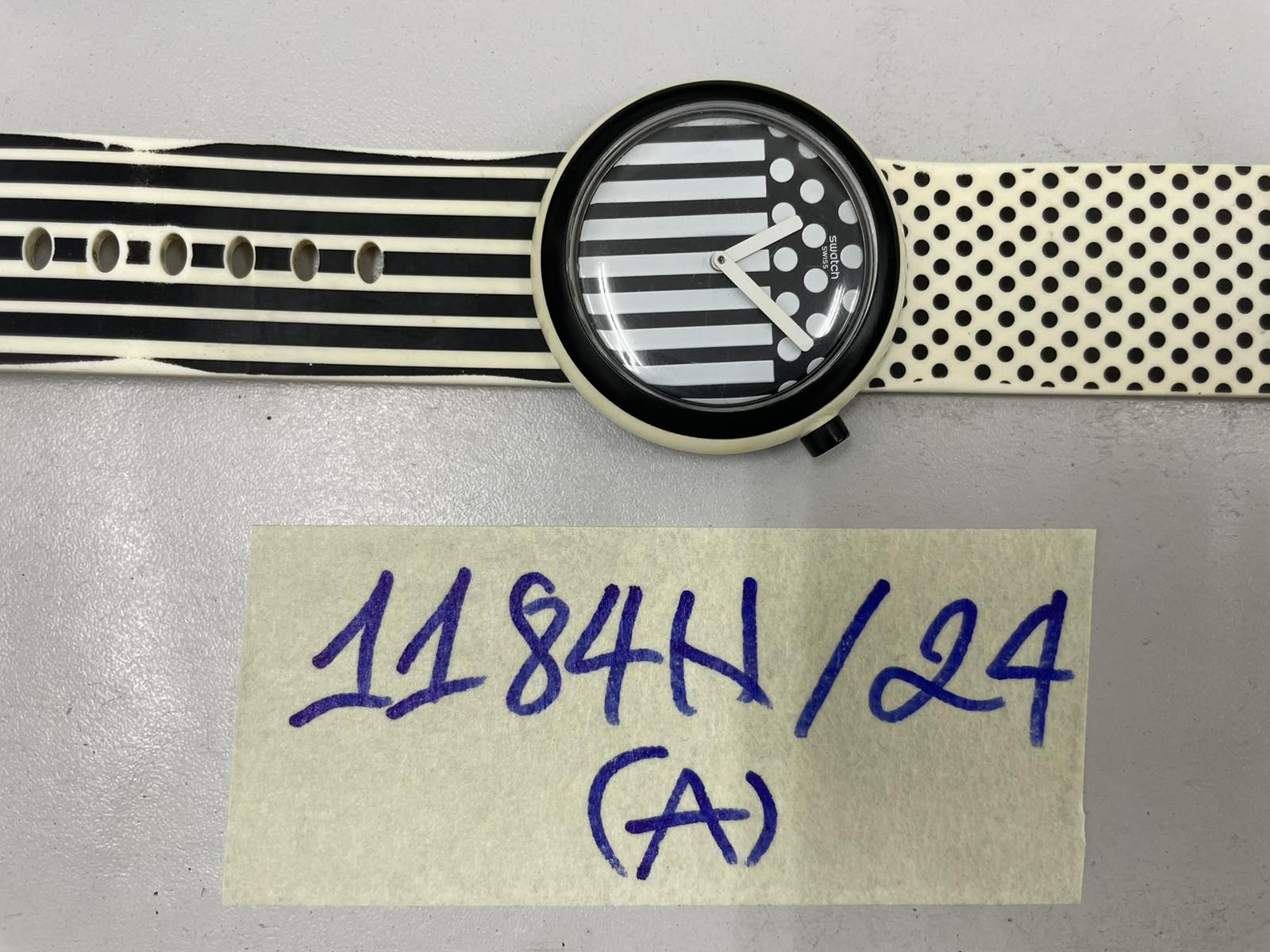 Ngày tiếp nhận: 22/7/2024 Mã hồ sơ: 1184N2024A Mô tả: 01 đồng hồ có logo chữ SWATCH mặt tròn viền đen/ trắng, dây cao su màu trắng sọc đen. |