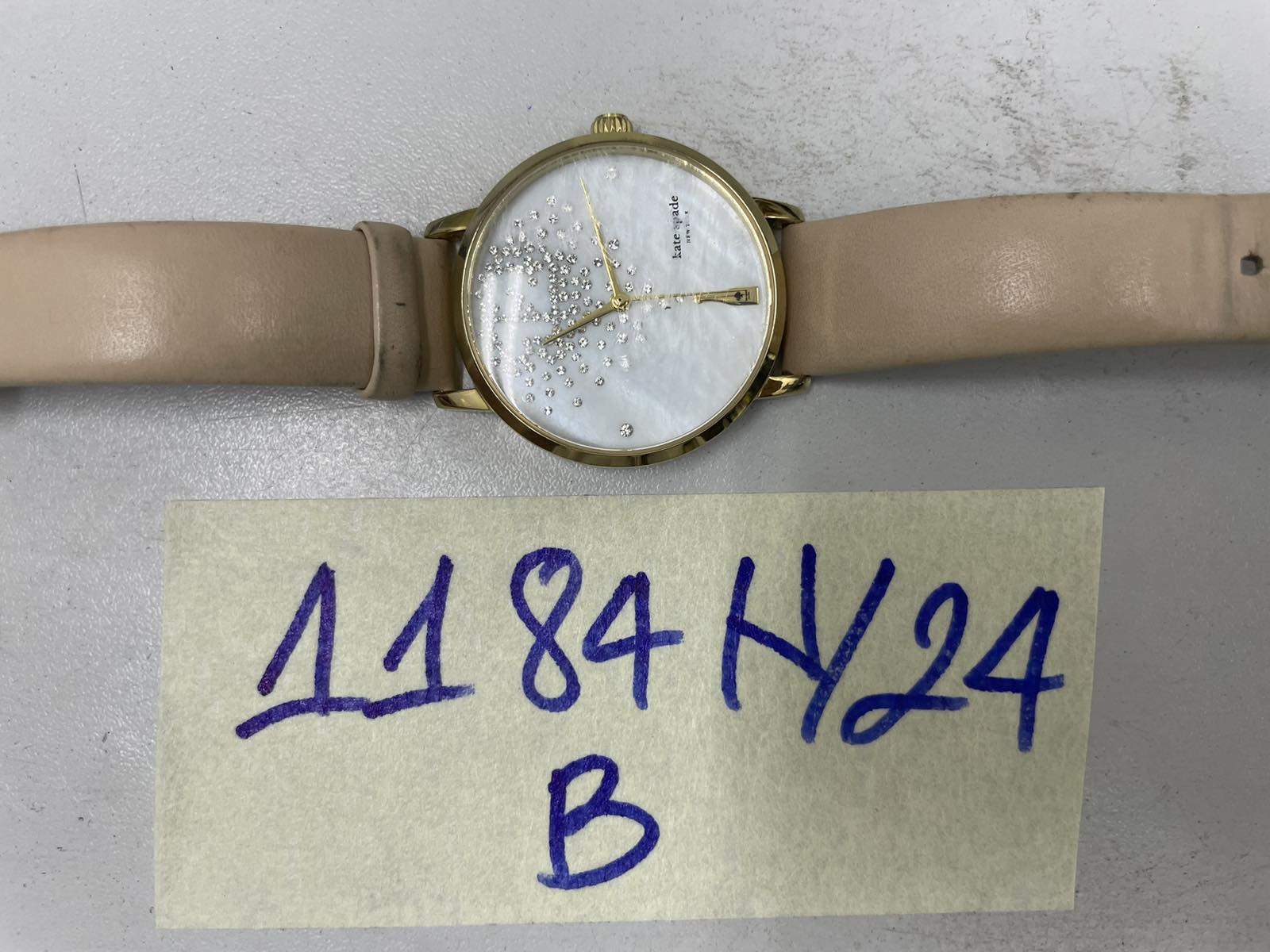 Ngày tiếp nhận: 22/7/2024 Mã hồ sơ: 1184N2024B Mô tả: 01 đồng hồ có logo chữ "kate spade" bằng kim loại mặt hình tròn màu vàng, dây giống da màu hồng. |