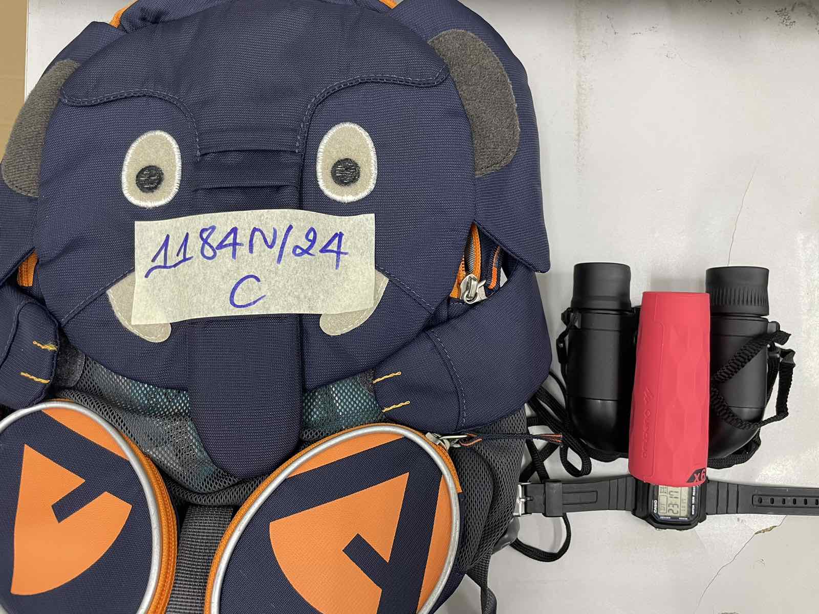 Ngày tiếp nhận: 22/7/2024 Mã hồ sơ: 1184N2024C Mô tả: 01 balo trẻ em màu lam đậm có hình con voi bên trong gồm 02 ống nhòm lần lượt là một màu đen và một màu đỏ, 01 đồng hồ có logo chữ CASIO mặt hình chữ nhật màu đen, dây nhựa và một số vật dụng cá nhân đã qua sử dụng. |