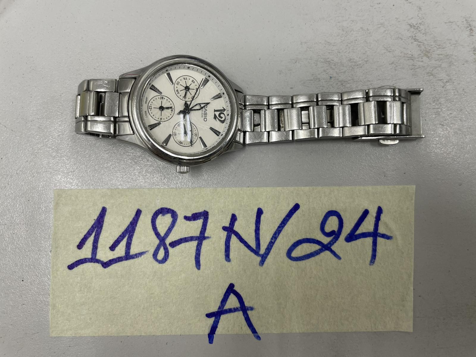 Ngày tiếp nhận: 22/7/2024 Mã hồ sơ: 1187N2024A Mô tả: 01 đồng hồ mặt hình tròn màu trắng có chữ CASIO dây đeo kim loại màu trắng. |