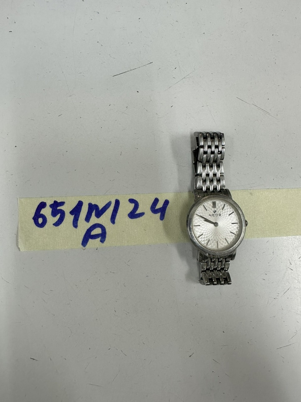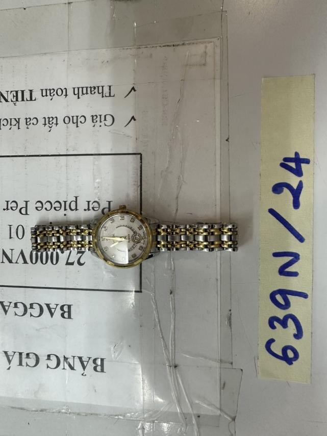 Ngày tiếp nhận: 23/4/2024 kim loại màu bạc, mặt đồng hồ nhiều vết xước. |