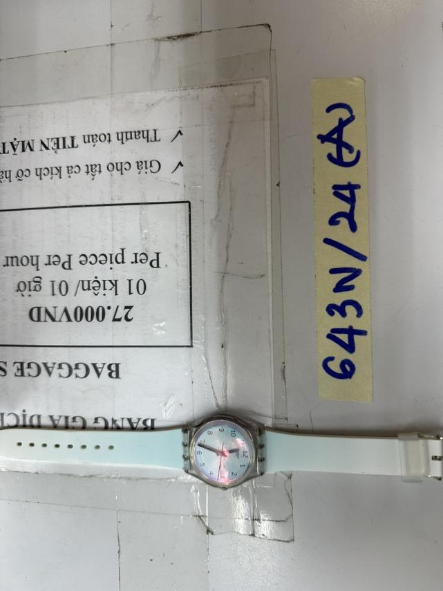 Ngày tiếp nhận: 23/4/2024 có chữ Swatch dây cao su màu xanh nhạt. |