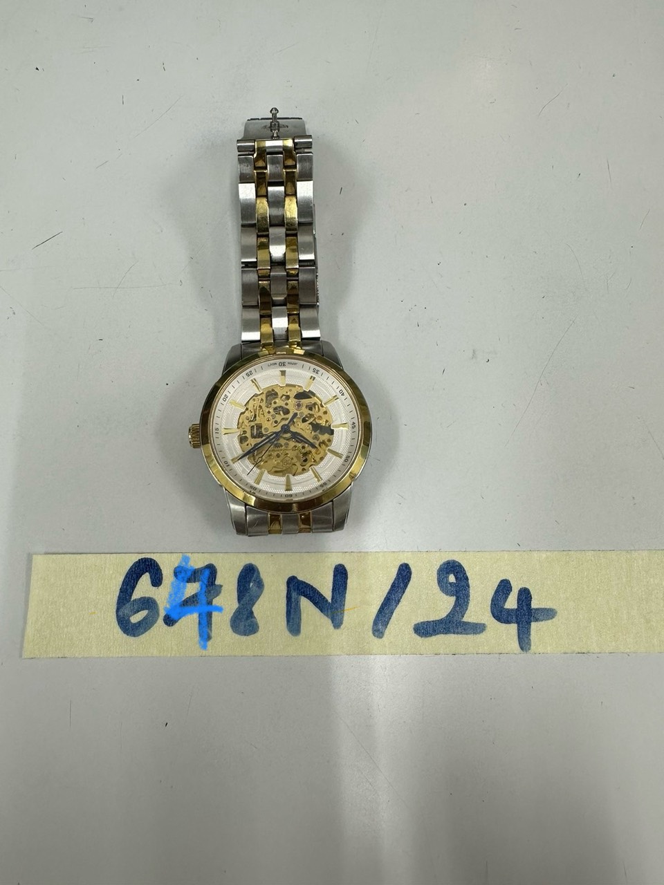 Ngày tiếp nhận: 24/4/2024 mặt sau của đồng hồ có chữ "JAPAN MOVEMENT SAPPHIRE AUTOMATIC 990-15AG ALL STAINLESS STEEL". |
