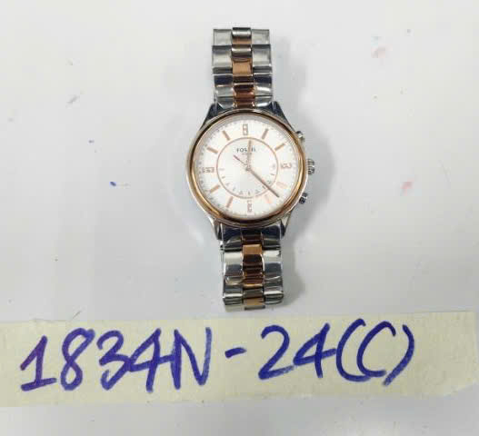 Mô tả: 01 Đồng hồ mặt tròn, dây KL màu bạc có chữ "Fossil Hybrid".