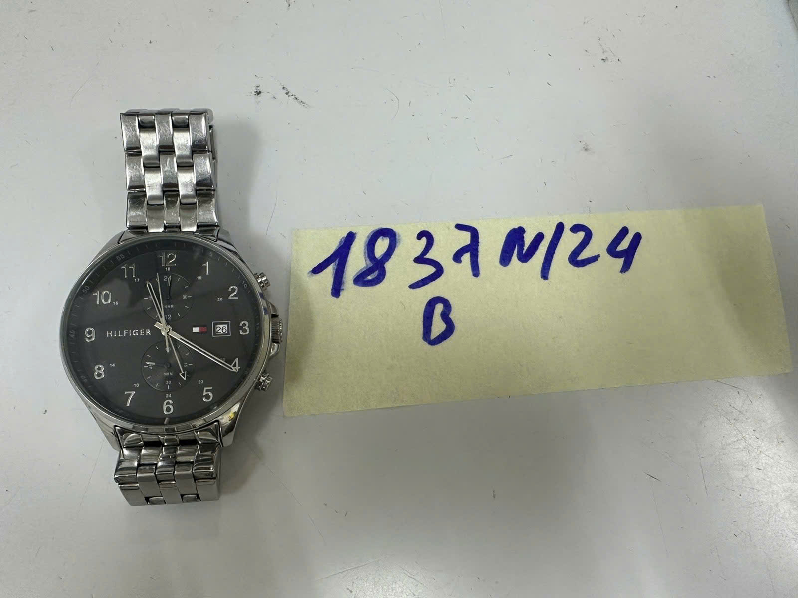 Mô tả: 01 đồng hồ đeo tay bằng kim loại màu bạc, mặt đồng hồ