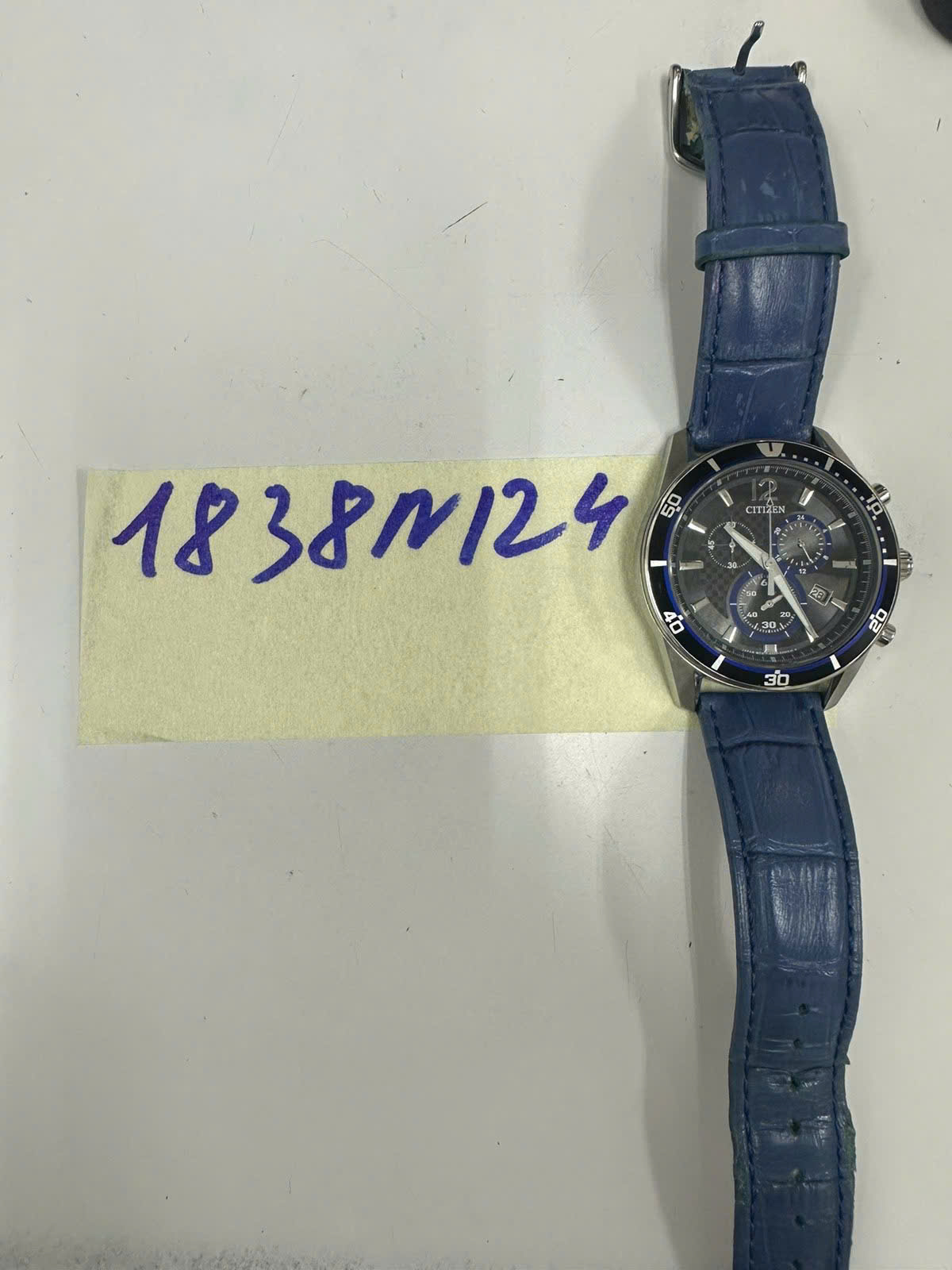 chữ "CITIZEN" màu đen/ xanh, mắt đồng hồ màu đen, dây đồng