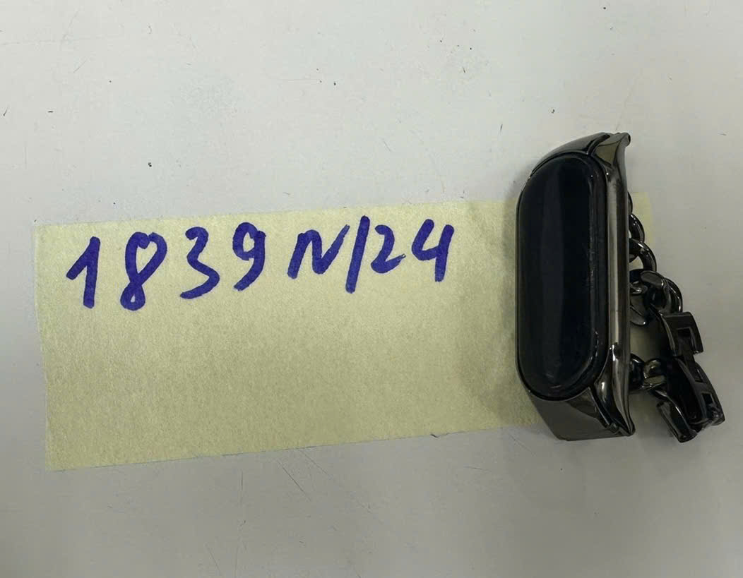 Mô tả: 01 đồng hồ thông minh có logo chữ "MI" màu đen, dây kim loại màu đen.