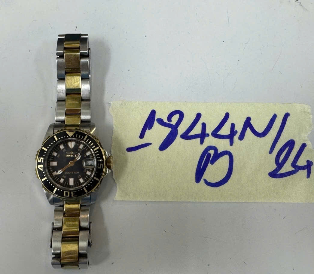 Mô tả: 01 đồng hồ dây kim loại màu vàng và bạc, có chữ "Invicta".