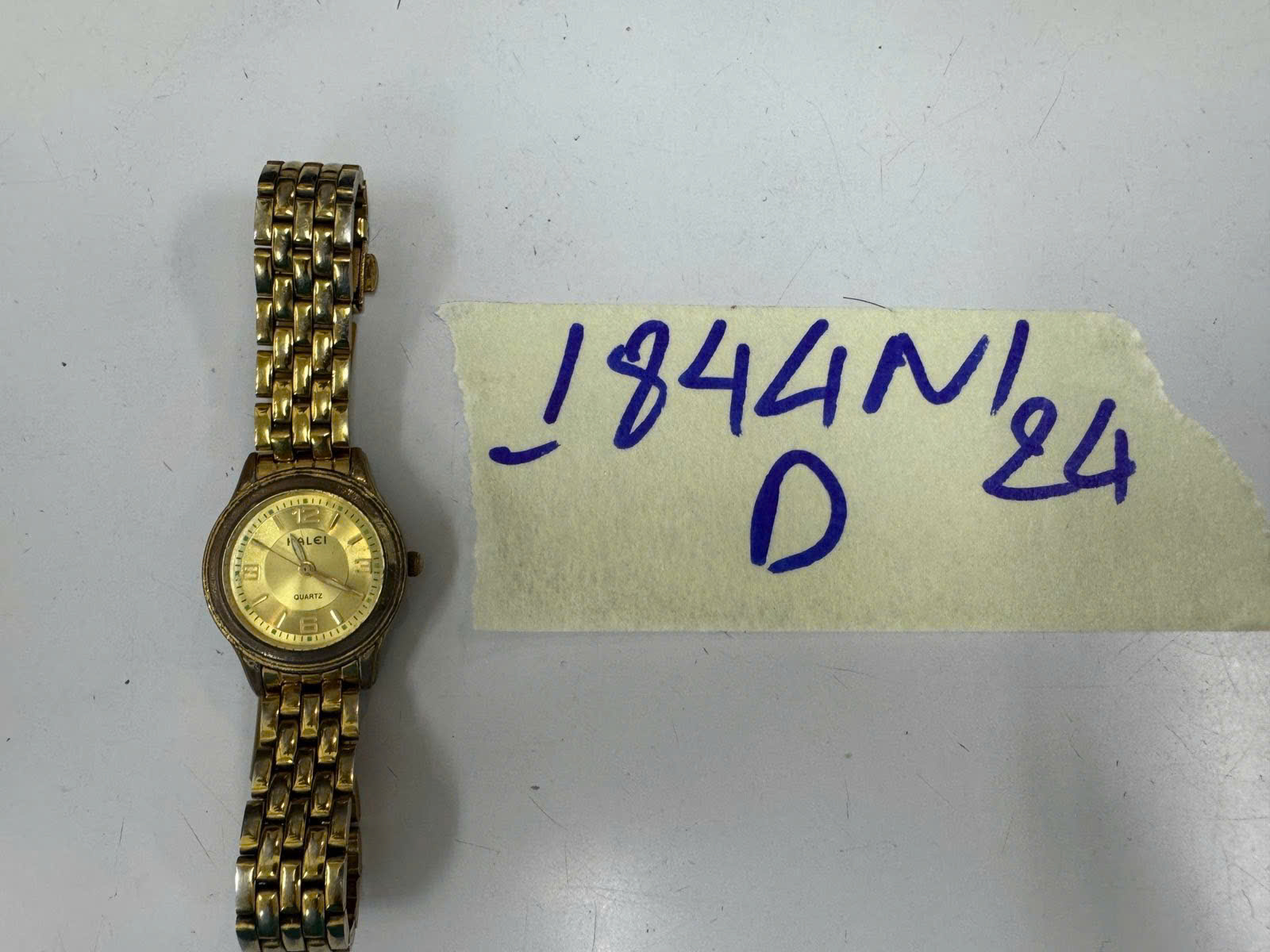 Mô tả: 01 đồng hồ mặt tròn dây kim loại màu vàng có chữ "HALEI".