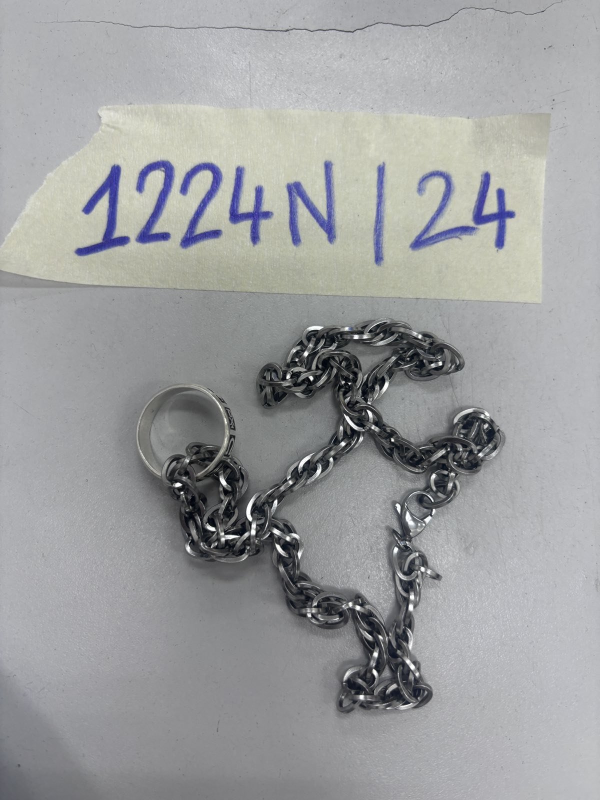 Ngày tiếp nhận: 27/7/2024 Mã hồ sơ: 1224N2024 Mô tả: 01 dây chuyền bằng kim loại ở bên trong dây chuyền có nhẫn bằng kim loại chữ SV 92524. |