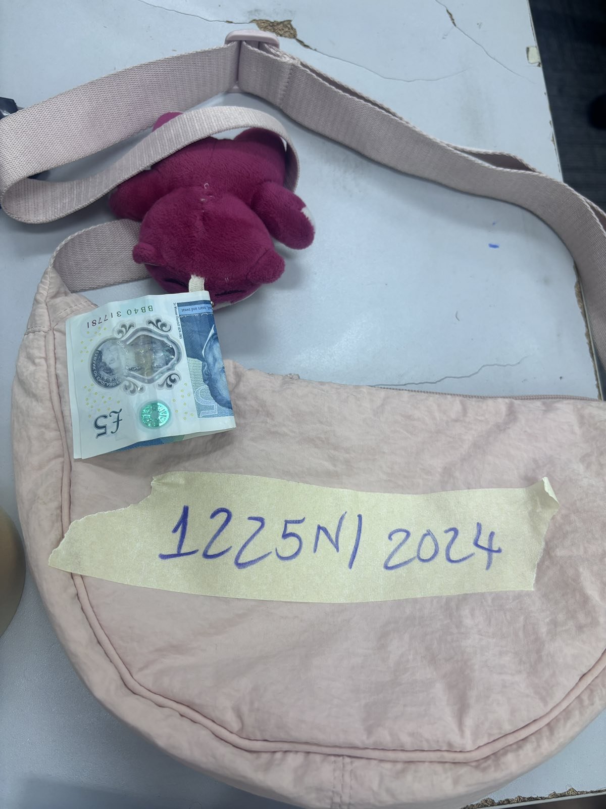 Ngày tiếp nhận: 27/7/2024 Mã hồ sơ: 1225N2024 Mô tả: 01 túi vải màu hồng có 01 tờ tiền mệnh giá 5 pounds bên trong túi. |