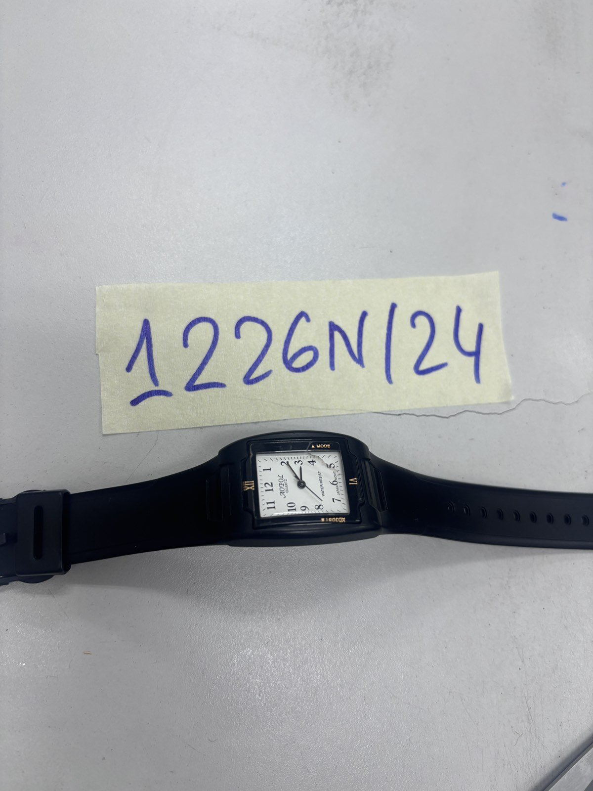 Ngày tiếp nhận: 27/7/2024 Mã hồ sơ: 1226N2024 Mô tả: 01 đồng hồ có logo chữ AOPOL QUARTZ mặt hình chữ nhật bằng kim loại màu đen dây nhựa. |