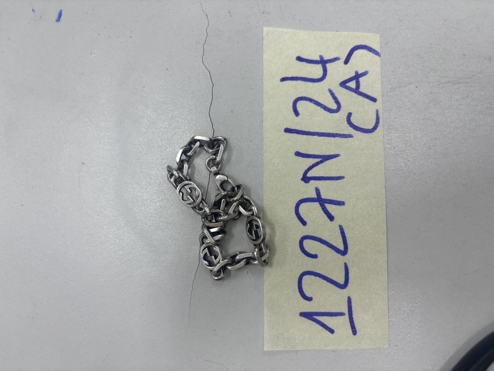 Ngày tiếp nhận: 27/7/2024 Mã hồ sơ: 1227N2024A Mô tả: 01 vòng đeo tay bằng kim loại màu trắng, móc dây xích. |