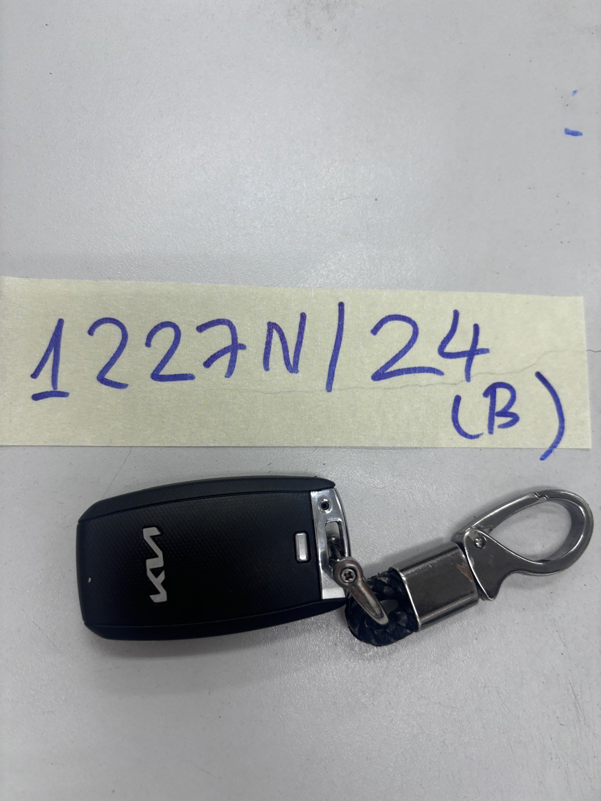Ngày tiếp nhận: 27/7/2024 Mã hồ sơ: 1227N2024B Mô tả: 01 chìa khóa xe oto màu đen bạc có chữ KIA. |
